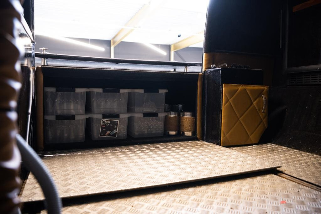The interior has been designed with a minimalist and elegant approach, perfectly suited to premium champagne service. The Bubbelbus is equipped with two wine/champagne refrigerators, ensuring bottles are always served at the correct temperature. There is one serving point, allowing for controlled and refined presentation. A striking feature is the hydraulically operated service door, which opens via remote control and creates an impressive reveal at any event.