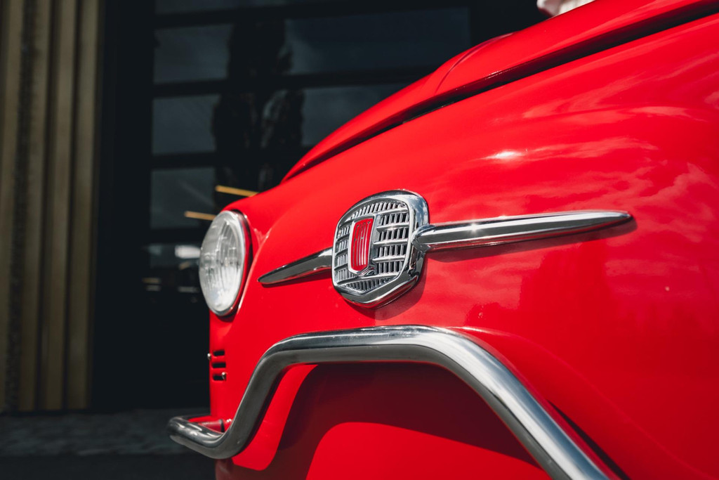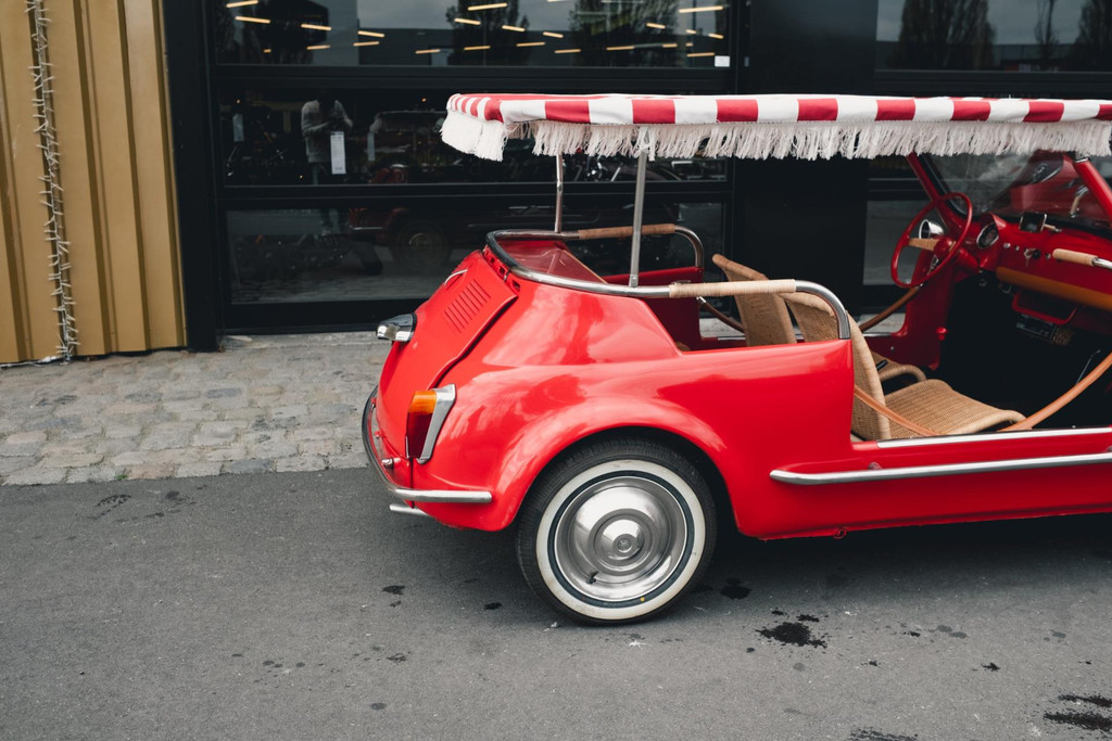 De auto is gespoten in een prachtige zachte roodtint met een vleugje perzik — een kleur die perfect past bij het zomerse karakter van deze klassieke Fiat. Het interieur is voorzien van stijlvolle rieten stoelen en een speels zonnedakje met witte franjes, helemaal in lijn met de iconische Jolly-stijl.