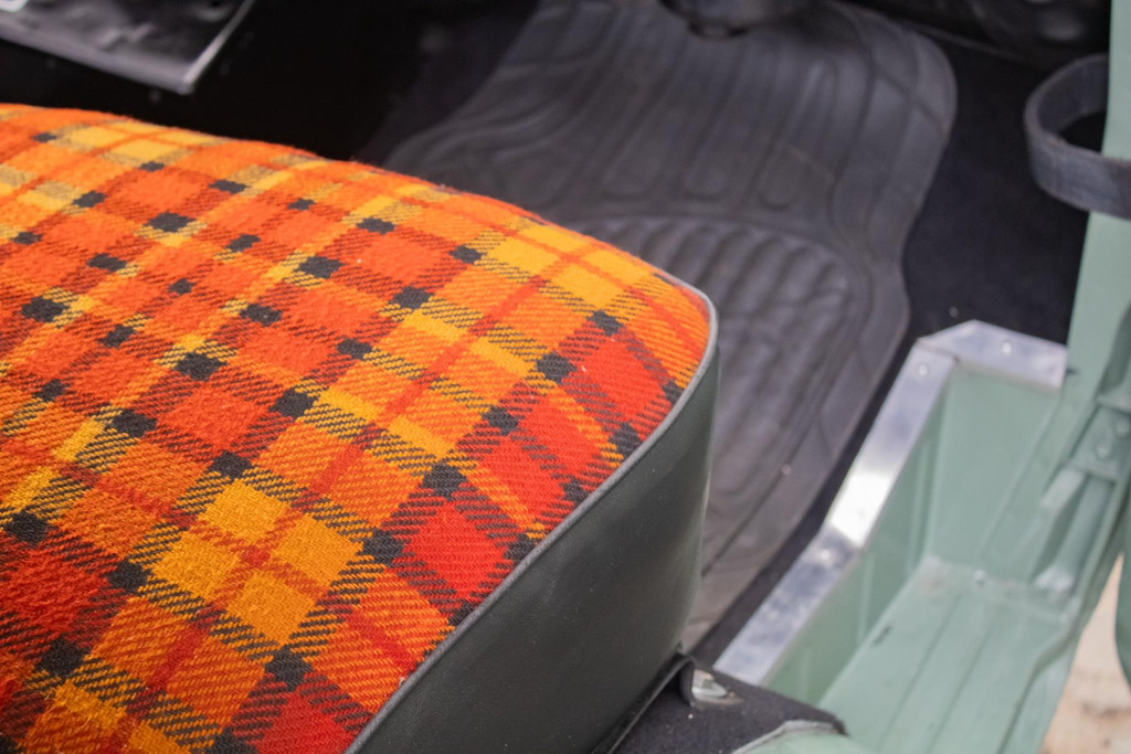 Im Innenraum finden wir eine originelle, aber einzigartige Ausstattung mit Tartan-Polstern in Orange, Rot und Schwarz - eine Anspielung auf die 1960er Jahre, aber mit einem frischen, individuellen Touch. Alles ist sehr gepflegt und funktionell.