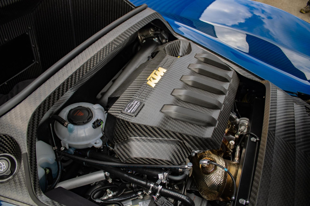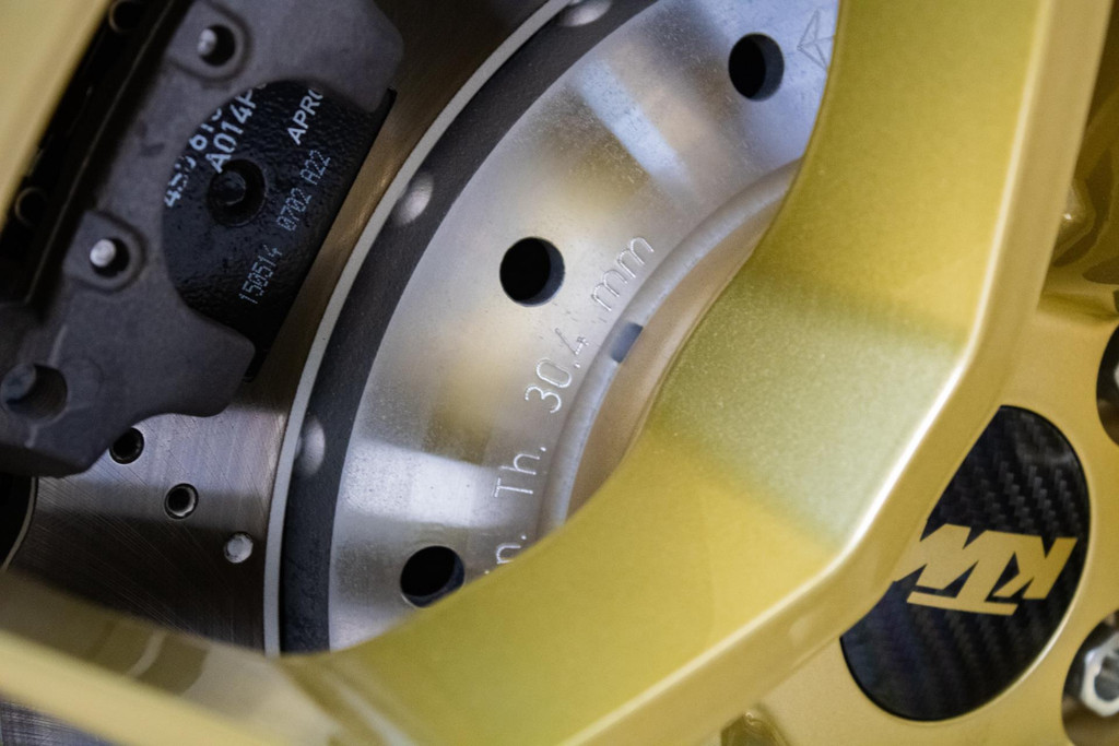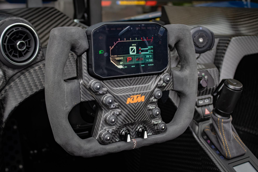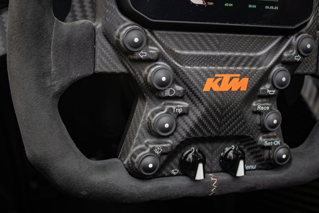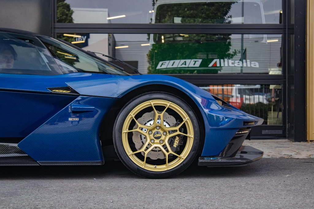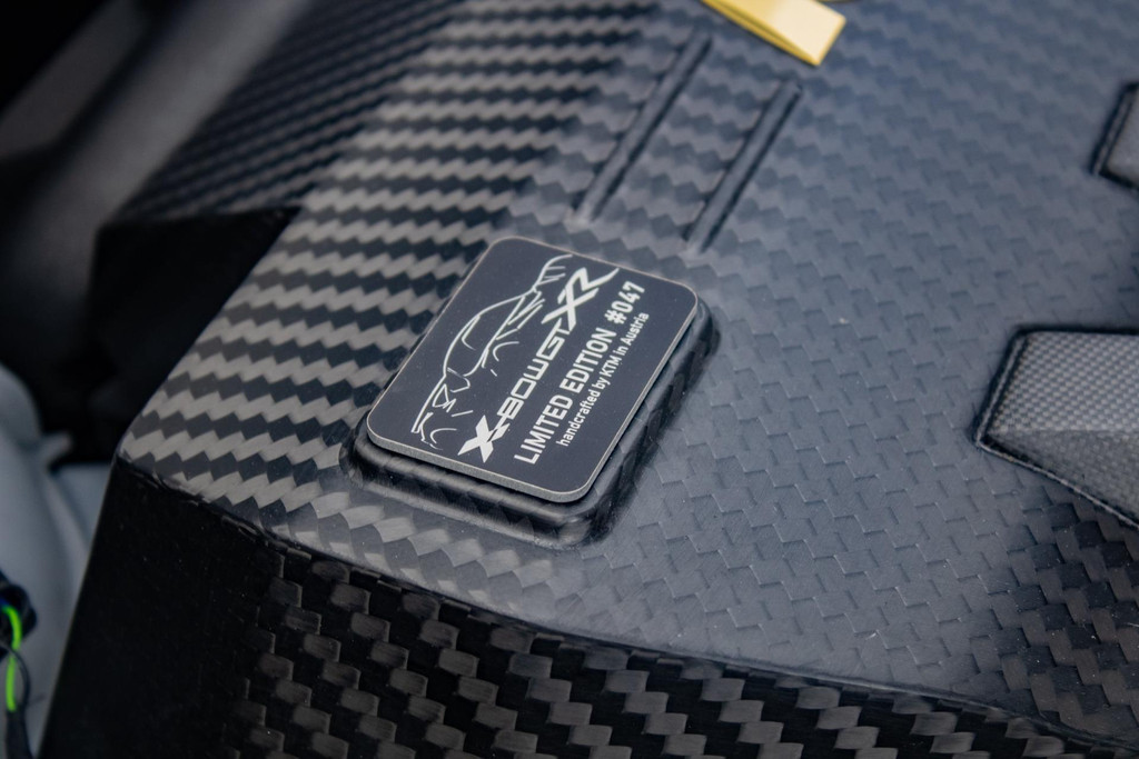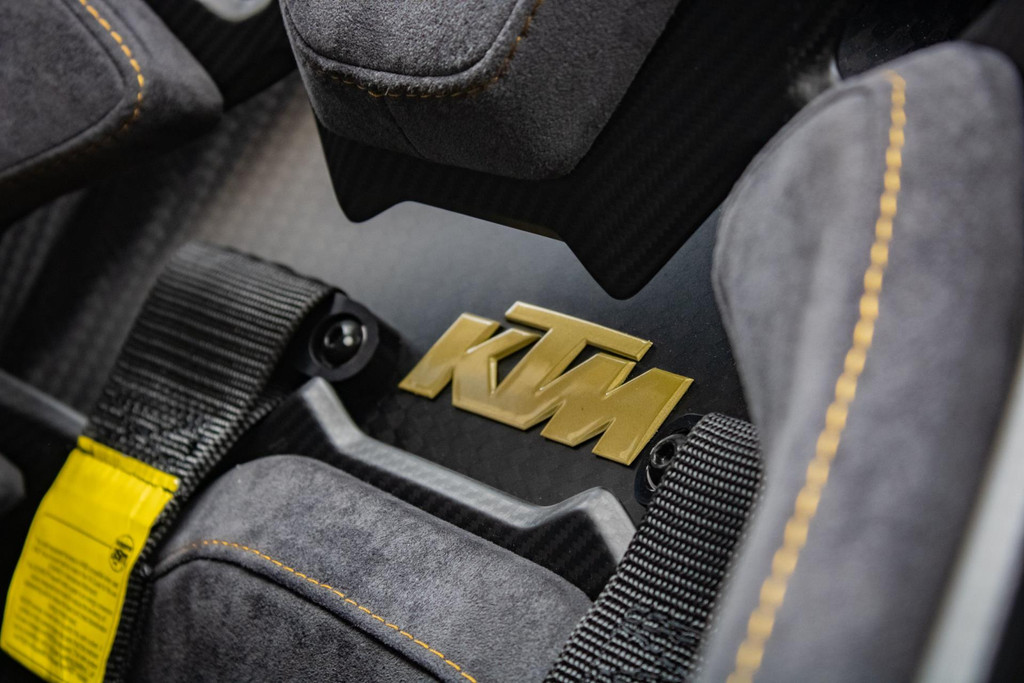 Dieses Exemplar hat nur 27 Testkilometer auf dem Kilometerzähler und ist in absolutem Neuzustand. Das Fahrzeug wurde auch im Detail mit exklusiven goldfarbenen Akzenten personalisiert: So sind die Felgen in Gold Gloss lackiert, inklusive der KTM-Logos auf den Radnabenabdeckungen. Die Bremssättel sind ebenfalls in RAL 9005 schwarz mit goldenen Logos ausgeführt. Darüber hinaus sind die Aufhängung, die Embleme (innen und außen), die Nähte der Sitze, die Abschleppöse und die Plakette „100 Limited Edition“ in Gold ausgeführt. Der GT-XR fährt auf Pirelli P ZERO TROFEORACE Semi-Slicks, die auf 19-Zoll-Reifen vorne und 20-Zoll-Reifen hinten montiert sind.
