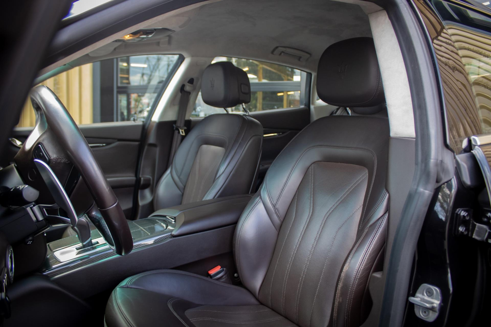 Het interieur biedt luxe en comfort met elektrisch verstelbare stoelen die zowel verwarmd als gekoeld kunnen worden, een vierzone automatische klimaatregeling, een premium audiosysteem, navigatie en diverse moderne comfortvoorzieningen zoals sleutelvrije toegang. Wat deze Quattroporte echt uniek maakt, is de sportstand waarin de kleppen van de originele uitlaat open gaan, waardoor een ongekend krachtig en diep motorgeluid vrijkomt dat de ervaring van rijden in deze Italiaanse sportlimousine onvergetelijk maakt.
