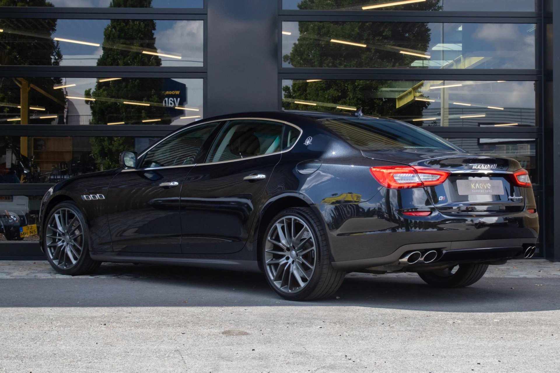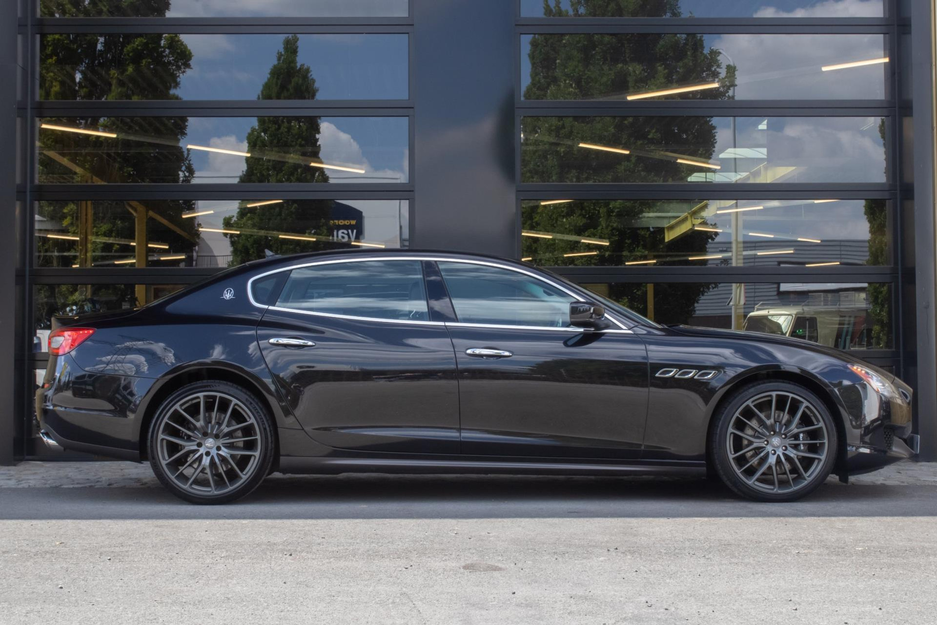 A stunning 2014 Maserati Quattroporte S Q4 with a mileage of 103,000 km. This luxury sports limousine is finished in the deep black metallic colour Nero Ribelle (Q815) and features a particularly beautiful interior with dark brown perforated leather, a beige/grey alcantara roof lining and full carbon trim in the interior. The car is equipped with a powerful 410 hp 3.0-litre V6 Bi-Turbo engine, an 8-speed automatic transmission and the Q4 all-wheel drive system, which ensures v