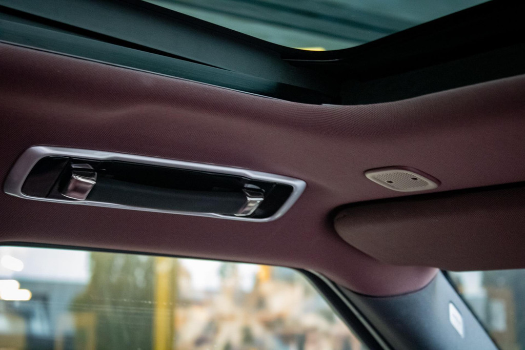 Het interieur is een toonbeeld van Britse luxe – uitgevoerd in diep bordeauxrood leder, inclusief hemelbekleding in dezelfde tint. De combinatie met donkermat houten inleg en het glazen panoramadak creëert een warme, exclusieve sfeer aan boord.