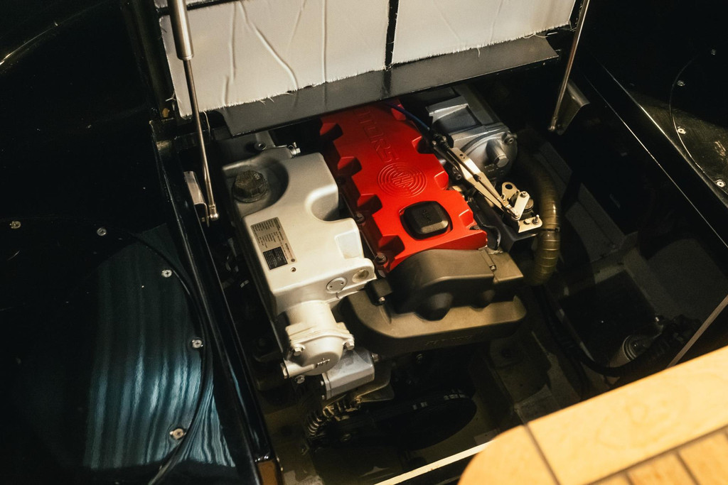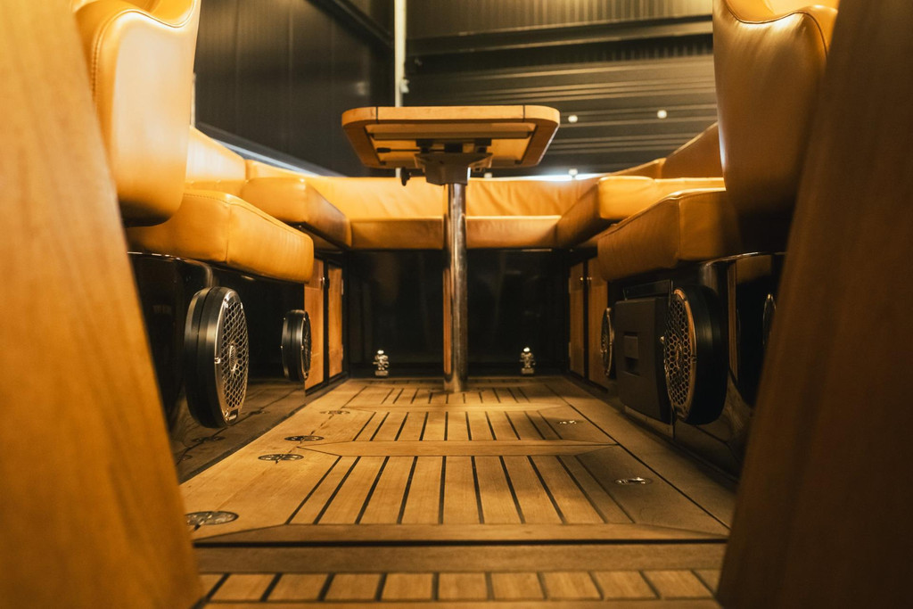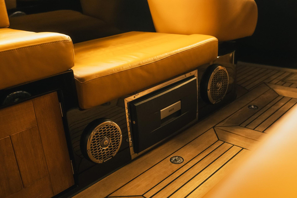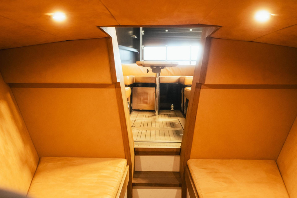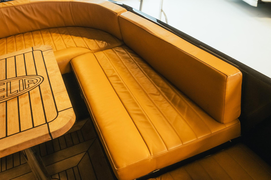 Das Interieur ist ebenso beeindruckend wie das Exterieur. Hellbraune Cognac-Lederpolster, stimmungsvolle Beleuchtung und moderne Teak-Holz-Akzente schaffen eine luxuriöse, warme Atmosphäre. Die Yacht verfügt über eine Kabine, zwei bequeme Innenbänke, einen runden Sitzbereich mit Tisch am Achterdeck, einen integrierten Kühlschrank und Polster für maximalen Komfort.