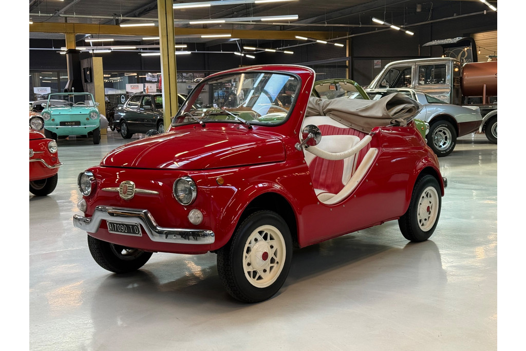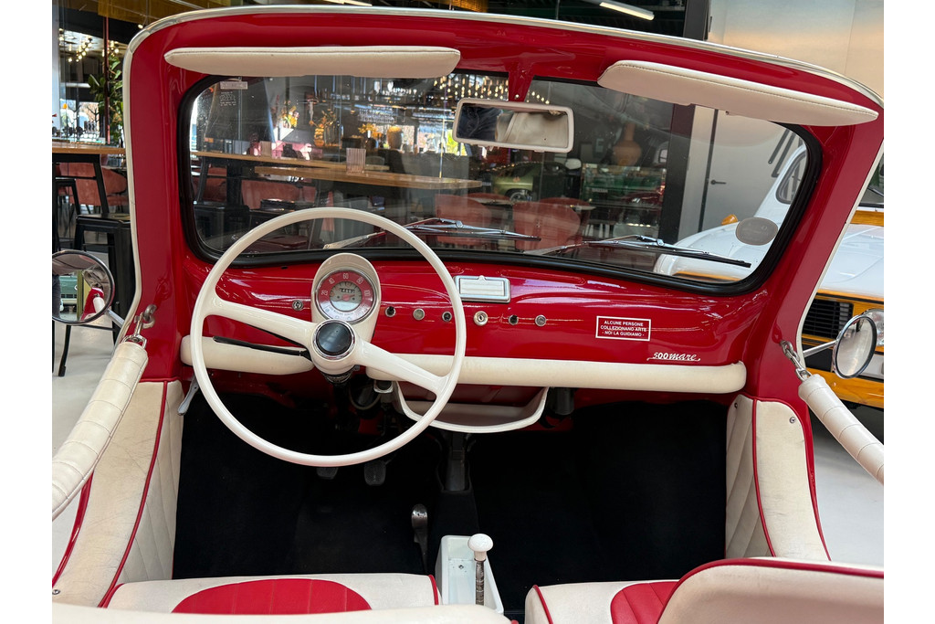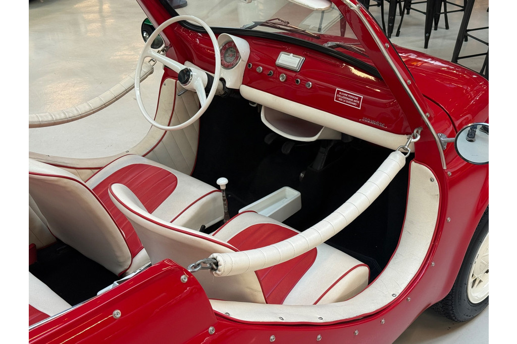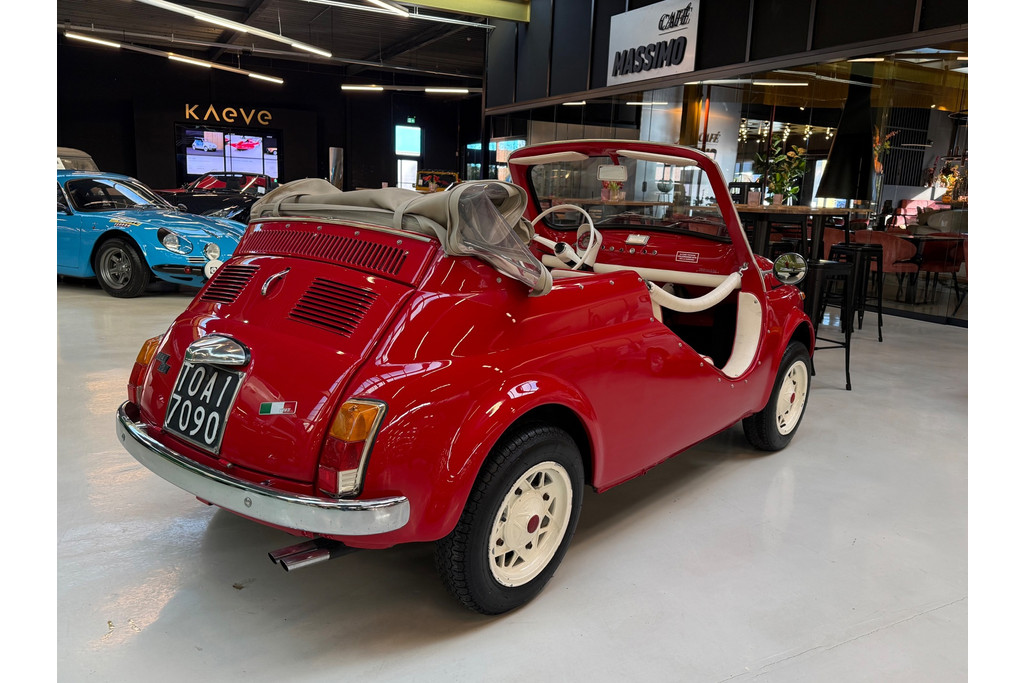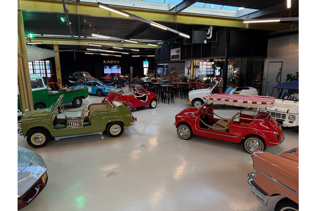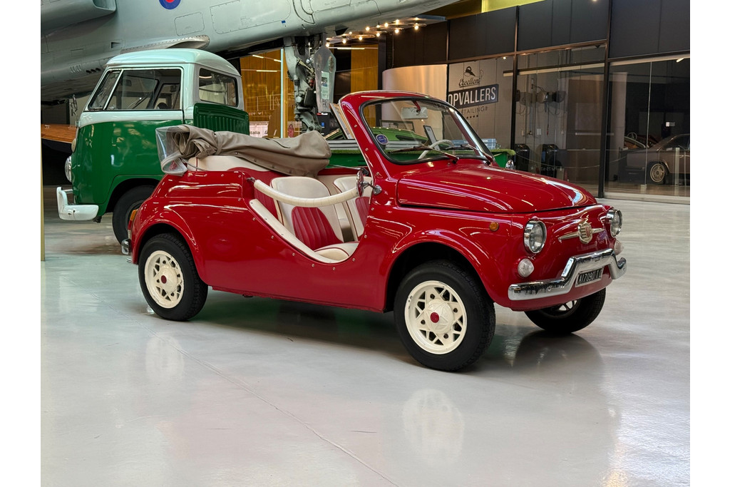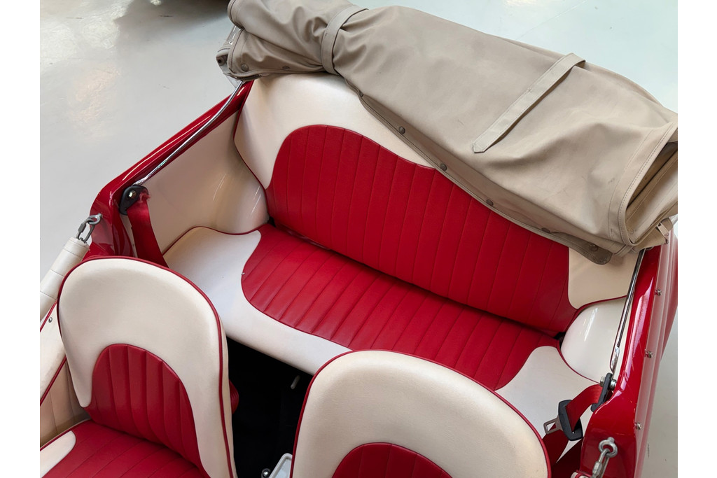 Uitgevoerd in een krachtige rode lak, gecombineerd met een rood-wit lederen interieur, ademt deze Jolly pure jaren ’60 charme. De crèmekleurige velgen zorgen voor een verfijnd contrast en versterken het klassieke silhouet. Het open karakter geeft de auto zijn onweerstaanbare uitstraling — luchtig, ontspannen en uitgesproken stijlvol.