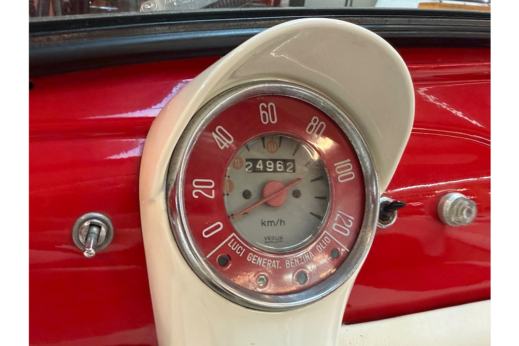 Lackiert in kräftigem Rot und kombiniert mit einem rot-weißen Lederinterieur, versprüht diese Jolly pure 60er-Jahre-Atmosphäre. Die cremefarbenen Felgen setzen einen harmonischen Kontrast und unterstreichen die klassische Linienführung. Der offene Charakter prägt das Fahrerlebnis — leicht, entspannt und stilvoll.