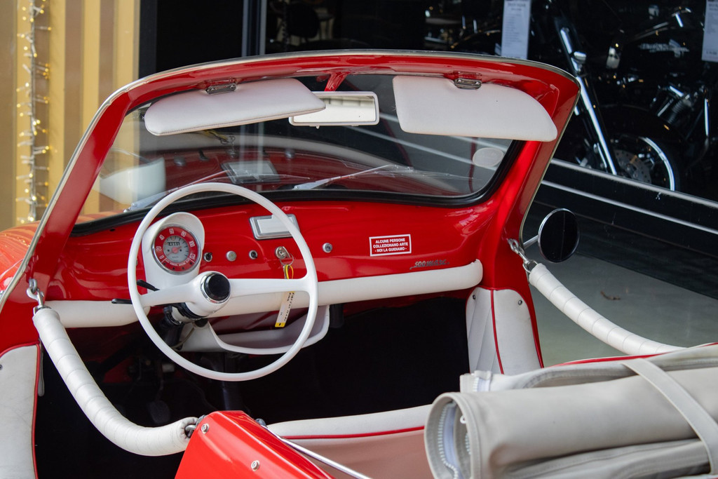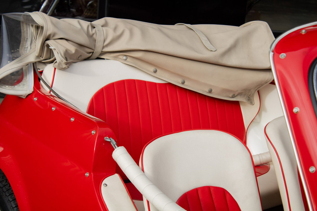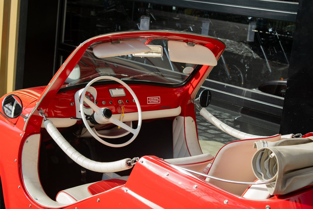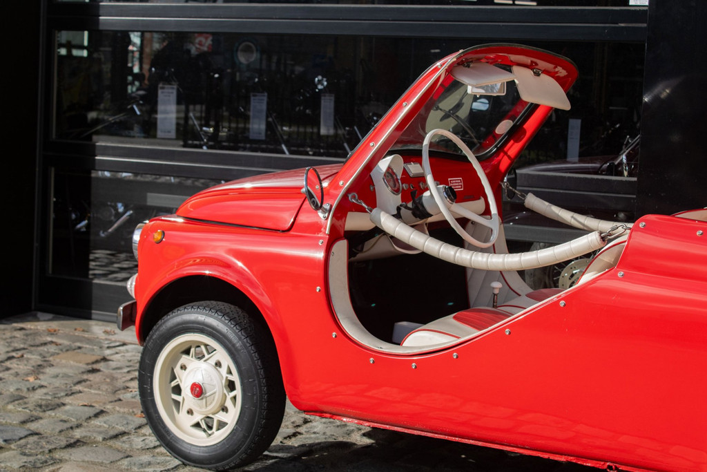 Uitgevoerd in een krachtige rode lak, gecombineerd met een rood-wit lederen interieur, ademt deze Jolly pure jaren ’60 charme. De crèmekleurige velgen zorgen voor een verfijnd contrast en versterken het klassieke silhouet. Het open karakter geeft de auto zijn onweerstaanbare uitstraling — luchtig, ontspannen en uitgesproken stijlvol.