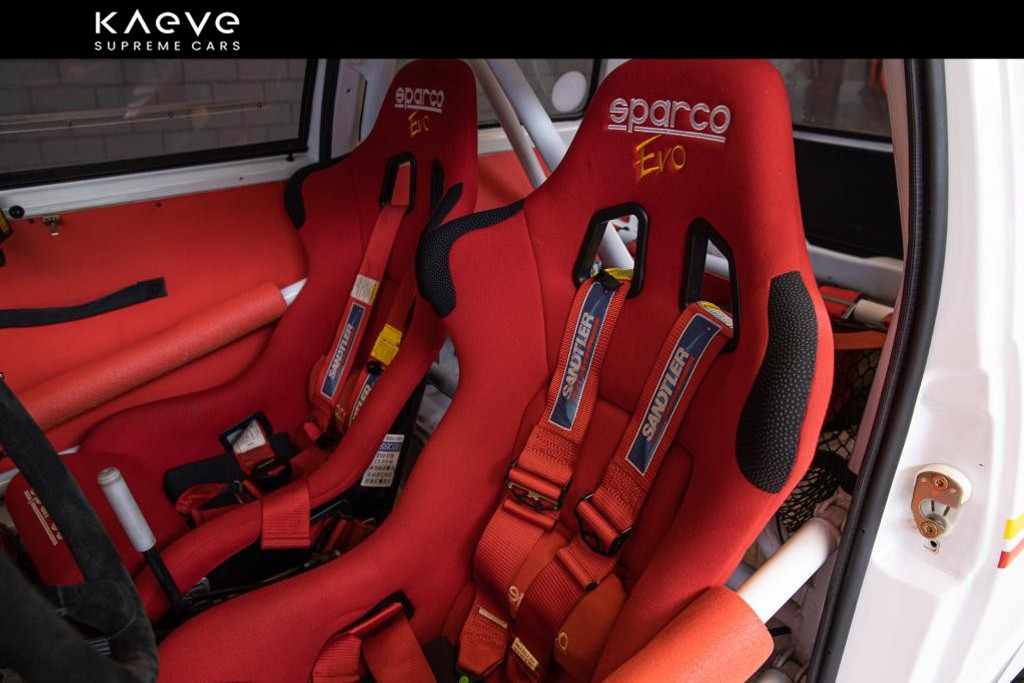 Farbe: Weiß, mit roten Sparco-Rennsitzen und Renngurten