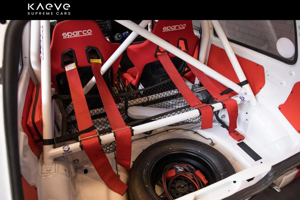 • Race-interieur met Sparco-stoelen, rolkooi en schakelaars voor elke elektrische functie.