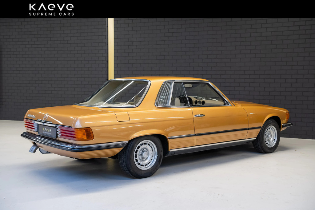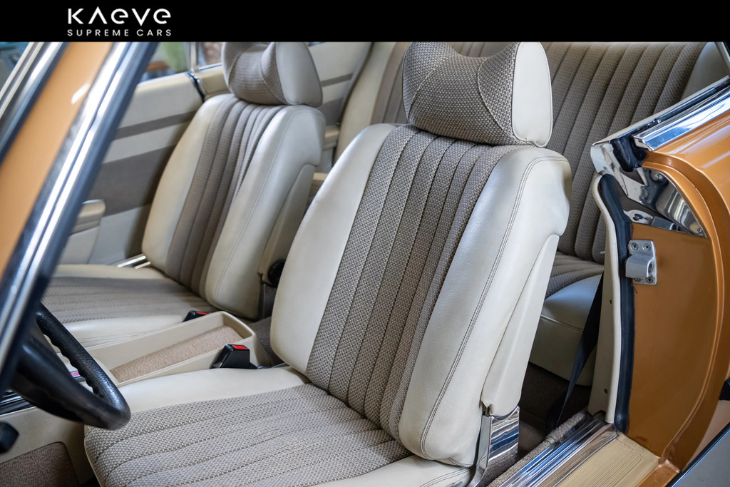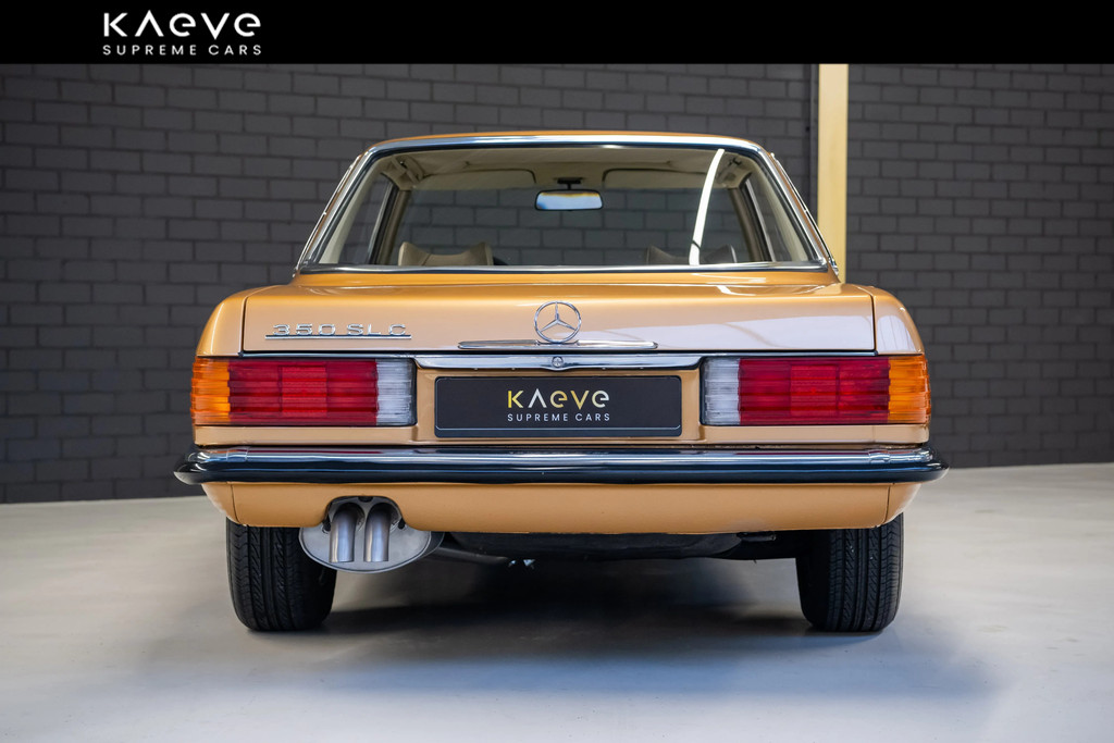 Dieses wunderschöne Exemplar in der Farbkombination „Byzanz Gold Metallic“ mit einem „Beigen“ Interieur. Es handelt sich um einen in Deutschland gelieferten 350 SLC, der immer noch eine deutsche Zulassung hat.