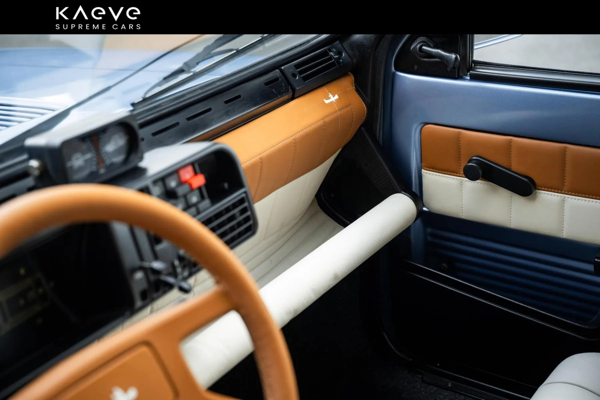 Die Karosserie ist in einem exklusiven Azzurro Blu lackiert – ein mediterranes Blau, das sofort an die Küsten Liguriens erinnert. Alle Kunststoffteile wie Stoßfänger, Spiegelkappen und Zierleisten wurden sorgfältig in Wagenfarbe lackiert. Die Blinker sind klar, die Linien rein – eine neue Eleganz für eine alte Ikone.