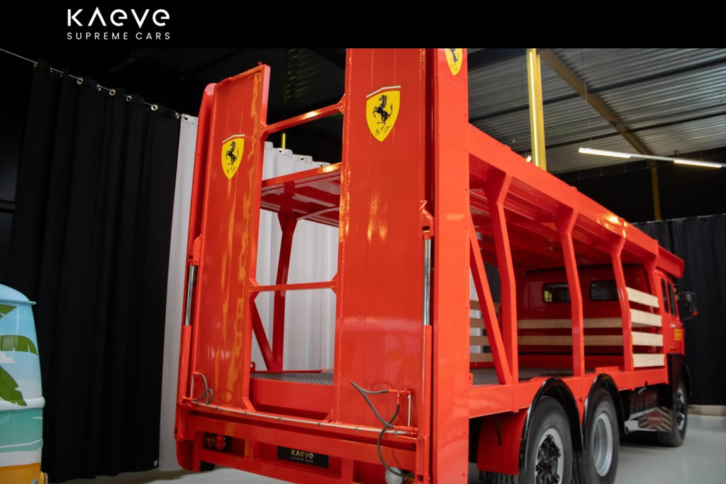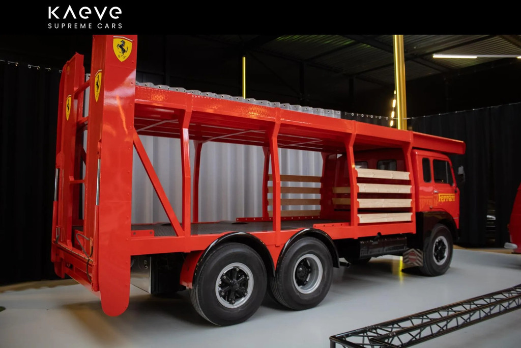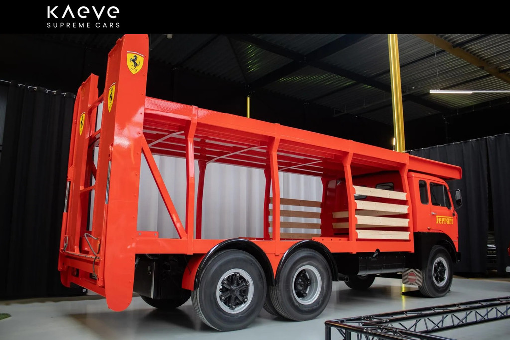 Volledig nieuw opgebouwde Ferrari transporter met laadklep waarmee op twee levels auto's geplaatst kunnen worden. Met unieke opties als nieuwe opbergkisten, handgeschilderde Ferrari schilden en houten frames is dit een prachtige 682N.