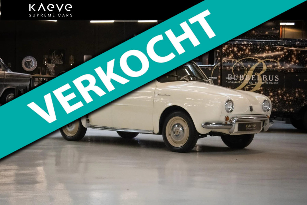 A beautiful white Renault Dauphine with only 42,043 kilometers on the odometer. This classic car, with license plate RH-69-ST, has been well cared for and features a manual transmission. It is a lovely oldtimer, perfect for leisurely drives and car shows.