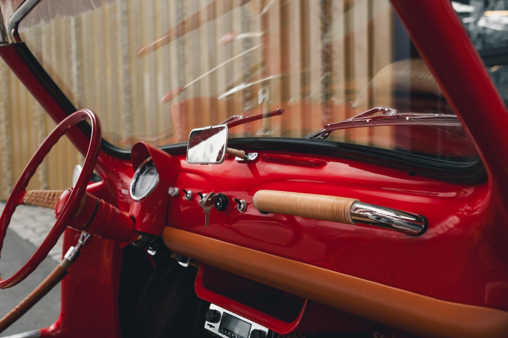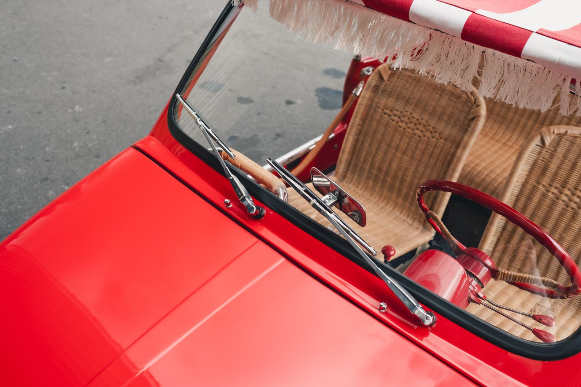 De auto is gespoten in een prachtige zachte roodtint met een vleugje perzik — een kleur die perfect past bij het zomerse karakter van deze klassieke Fiat. Het interieur is voorzien van stijlvolle rieten stoelen en een speels zonnedakje met witte franjes, helemaal in lijn met de iconische Jolly-stijl.