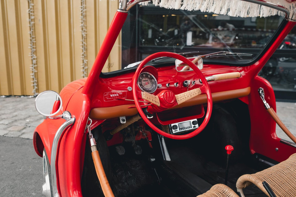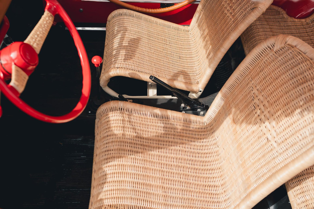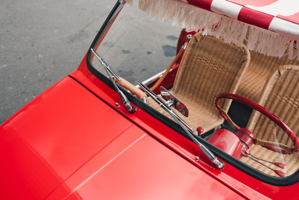 De auto is gespoten in een prachtige zachte roodtint met een vleugje perzik — een kleur die perfect past bij het zomerse karakter van deze klassieke Fiat. Het interieur is voorzien van stijlvolle rieten stoelen en een speels zonnedakje met witte franjes, helemaal in lijn met de iconische Jolly-stijl.