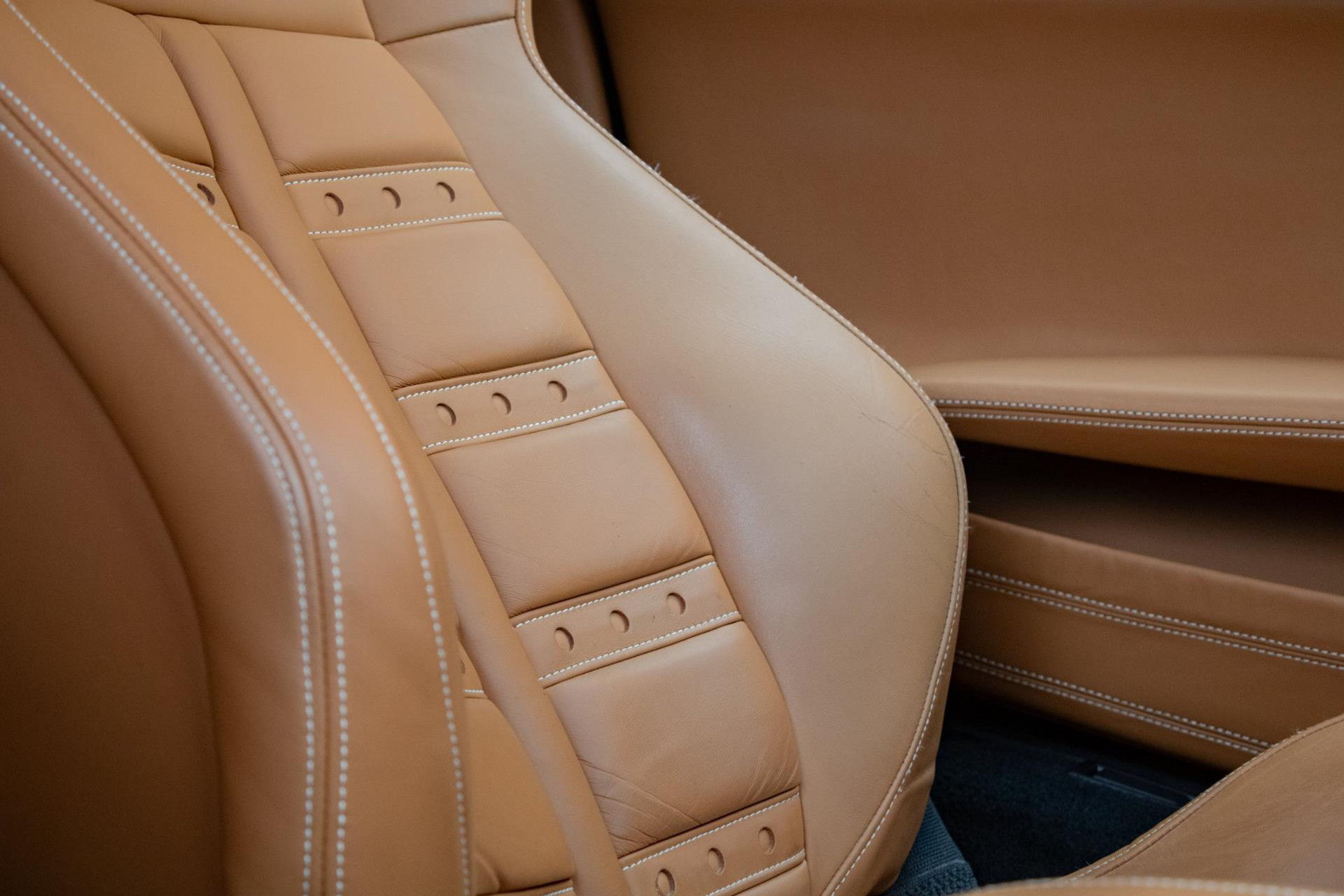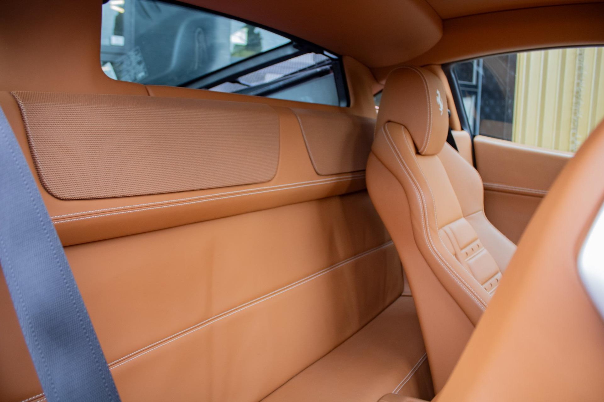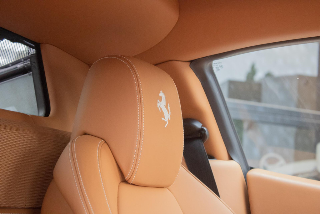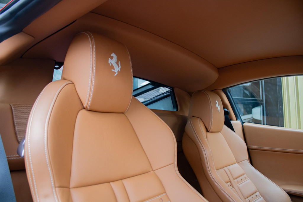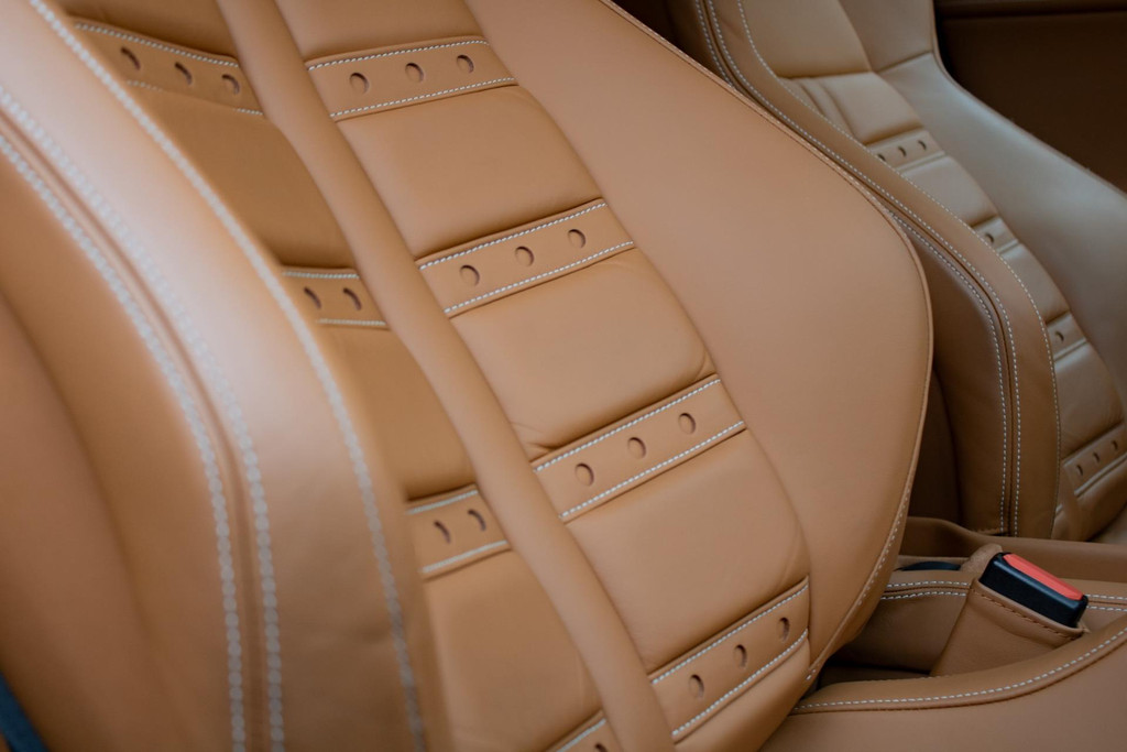 Het interieur straalt pure Italiaanse luxe en vakmanschap uit. De cabine is rijkelijk bekleed met Cuoio-leder (kleurcode 4609) – een warme karamelbruine tint die prachtig contrasteert met het exterieur. Dit hoogwaardige nappaleder is met uiterste precisie verwerkt op stoelen, dashboard (zowel boven- als onderzijde), portieren, middenconsole, achterbank en zelfs in de voetenruimte van de passagier. De stoelen zijn uitgevoerd in de klassieke Daytona-stijl bekleding en volledig elektrisch verstelbaar, wat zorgt voor zowel comfort als stijl. Het geheel wordt versterkt door speciaal stikwerk door het hele interieur, inclusief een met leder beklede dakhemel en een stijlvol afgewerkt lederen stuurwiel.