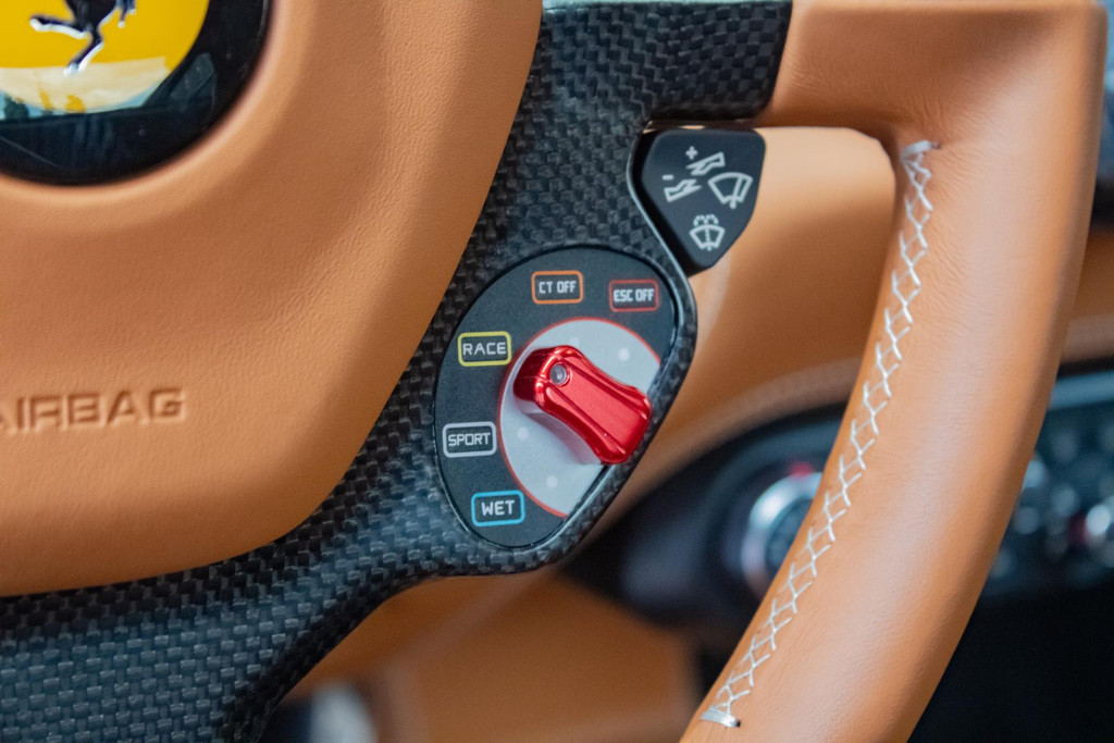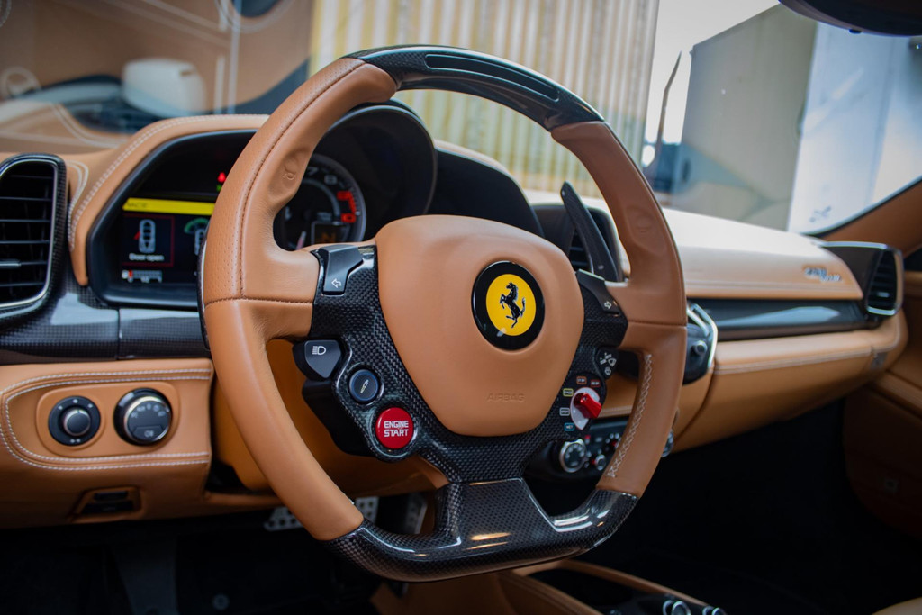 For those who appreciate sporty details, this 458 is equipped with an extensive carbon interior package, including a carbon steering wheel with integrated LED shift lights, carbon dashboard inserts, centre console, door panels, and door sills. These components underline the car’s racing DNA and give the cabin a sophisticated, performance-oriented appearance.