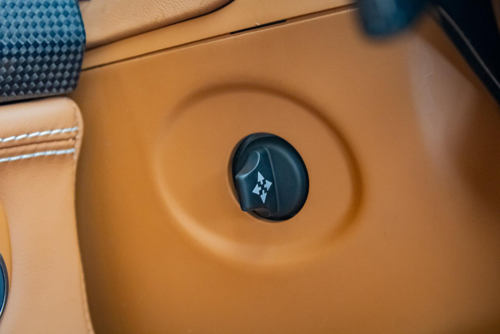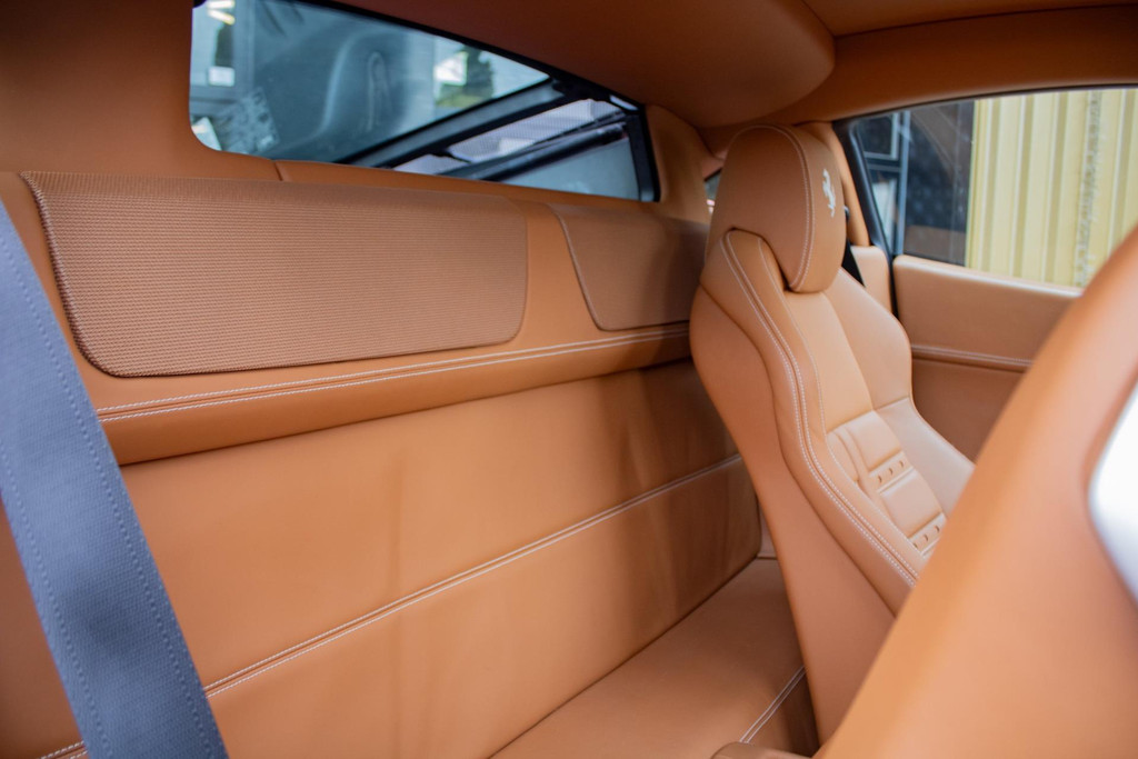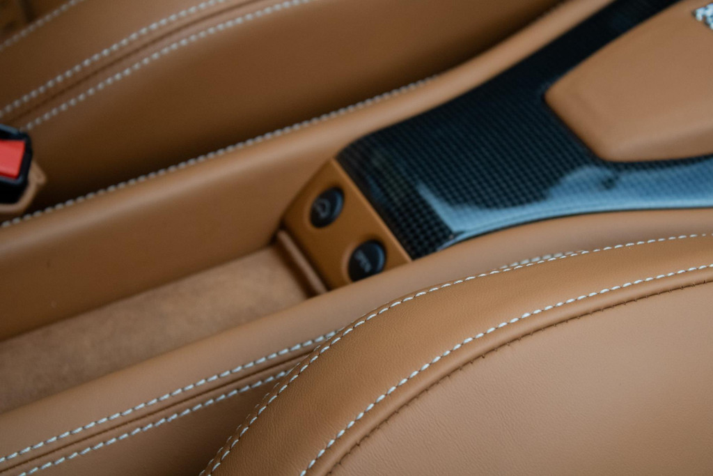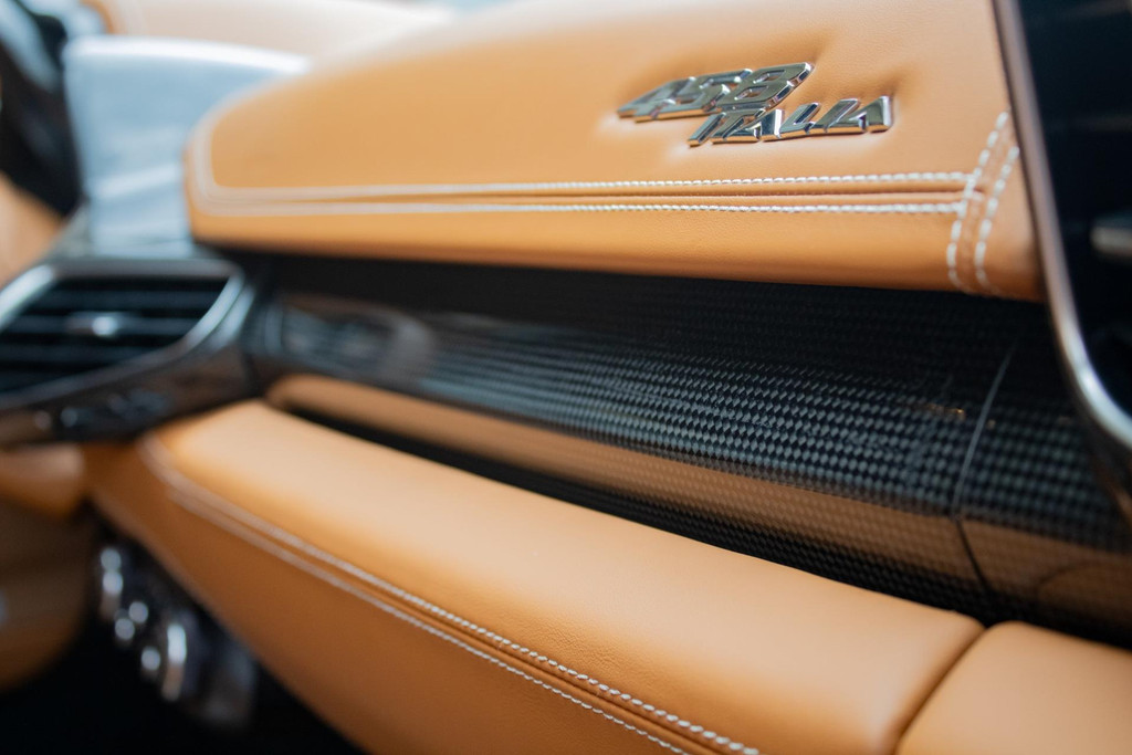 Het interieur straalt pure Italiaanse luxe en vakmanschap uit. De cabine is rijkelijk bekleed met Cuoio-leder (kleurcode 4609) – een warme karamelbruine tint die prachtig contrasteert met het exterieur. Dit hoogwaardige nappaleder is met uiterste precisie verwerkt op stoelen, dashboard (zowel boven- als onderzijde), portieren, middenconsole, achterbank en zelfs in de voetenruimte van de passagier. De stoelen zijn uitgevoerd in de klassieke Daytona-stijl bekleding en volledig elektrisch verstelbaar, wat zorgt voor zowel comfort als stijl. Het geheel wordt versterkt door speciaal stikwerk door het hele interieur, inclusief een met leder beklede dakhemel en een stijlvol afgewerkt lederen stuurwiel.