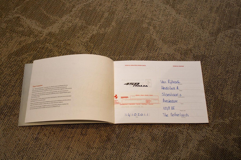 Voor wat betreft onderhoud is deze 458 Italia in perfecte staat. De volledige onderhoudshistorie is aantoonbaar en uitgevoerd door officiële Ferrari-dealers. Zo vond op 7 maart 2022 bij 64.176 kilometer een uitgebreide onderhoudsbeurt plaats, inclusief vervanging van de motorluchtfilter, motorolie, oliefilter en compressorriem. Op 20 februari 2023, bij 64.493 kilometer, volgde een jaarlijkse service met vervanging van het dynamic filter en de oliefilter. Alle openstaande terugroepacties en fabriekscampagnes zijn tijdig en correct uitgevoerd.