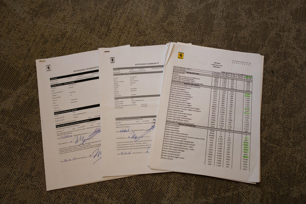 Voor wat betreft onderhoud is deze 458 Italia in perfecte staat. De volledige onderhoudshistorie is aantoonbaar en uitgevoerd door officiële Ferrari-dealers. Zo vond op 7 maart 2022 bij 64.176 kilometer een uitgebreide onderhoudsbeurt plaats, inclusief vervanging van de motorluchtfilter, motorolie, oliefilter en compressorriem. Op 20 februari 2023, bij 64.493 kilometer, volgde een jaarlijkse service met vervanging van het dynamic filter en de oliefilter. Alle openstaande terugroepacties en fabriekscampagnes zijn tijdig en correct uitgevoerd.