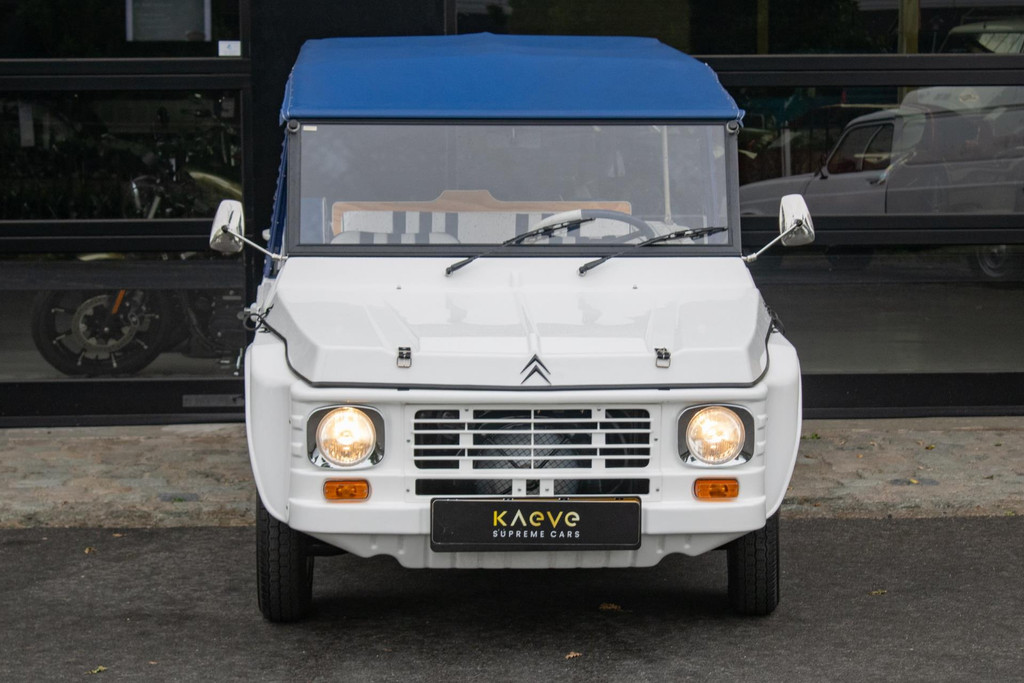 Citroën Méhari uit 1980, uitgevoerd in wit met een blauw-wit gestreept interieur en een bijpassende blauwe huif. Deze klassieke Méhari heeft slechts 40.000 kilometer gereden en verkeert in uitmuntende staat. Compleet en goed onderhouden, een uitstekende representant van dit iconische model.