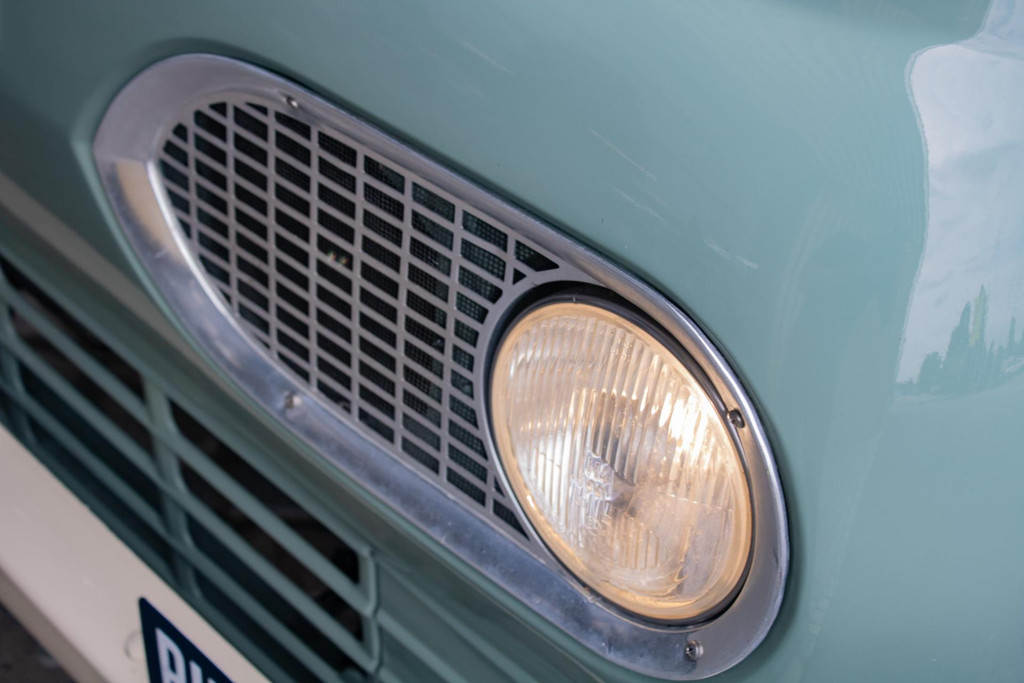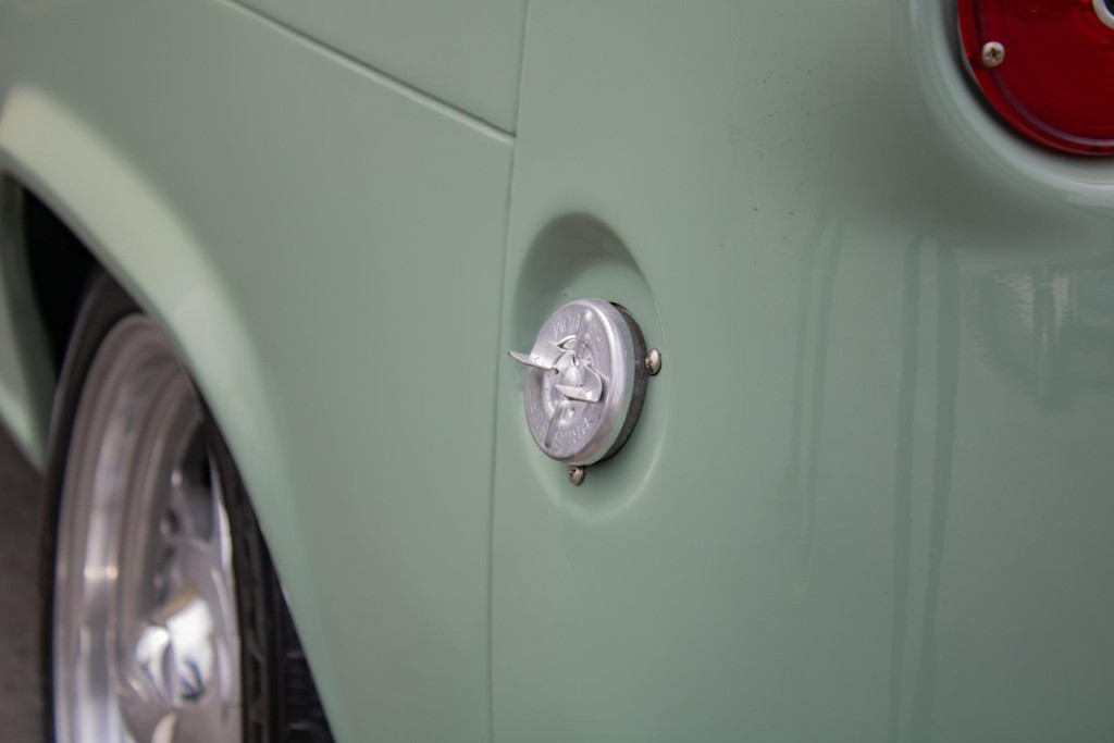 Die Lackierung ist in einem stilvollen hellen Olivgrün gehalten, das schön mit weißen Akzenten kombiniert ist, die die klassischen Linien betonen. Der Laderaum wurde mit Holzteilen und Aluminiumleisten komplett neu aufgebaut, was ihm einen handwerklichen und hochwertigen Look verleiht. Der Pick-up ist mit Leichtmetallrädern von Eagle Alloys und verchromten Spiegeln ausgestattet, die seinen Retro-Charakter noch unterstreichen.