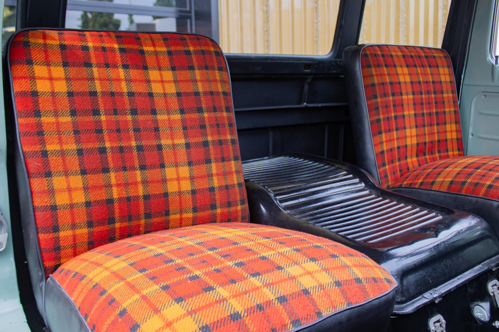 Im Innenraum finden wir eine originelle, aber einzigartige Ausstattung mit Tartan-Polstern in Orange, Rot und Schwarz - eine Anspielung auf die 1960er Jahre, aber mit einem frischen, individuellen Touch. Alles ist sehr gepflegt und funktionell.