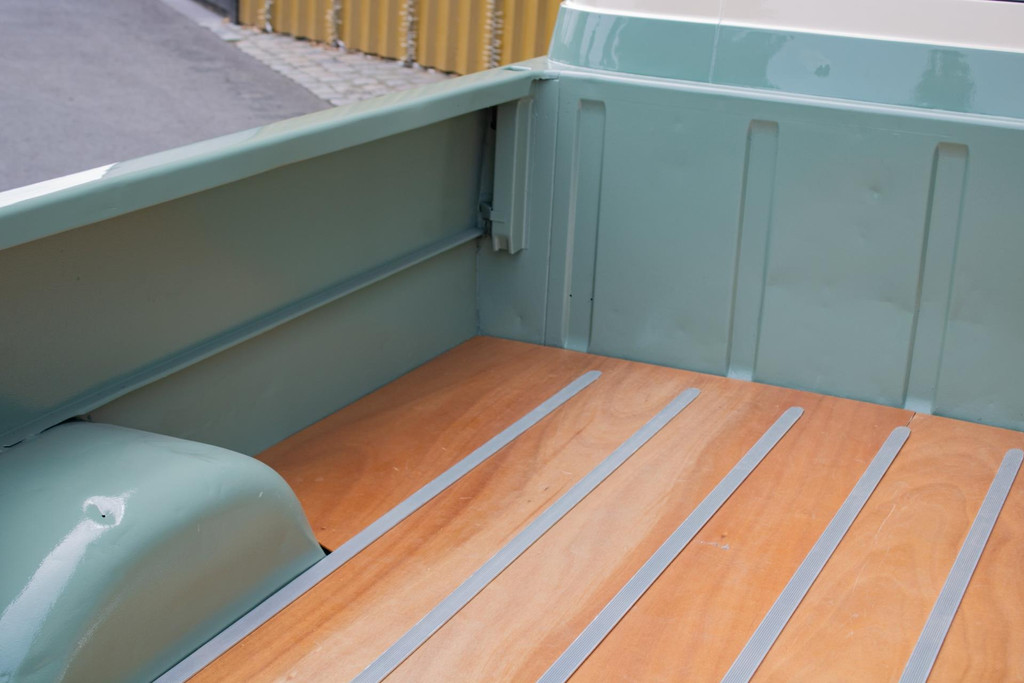 Die Lackierung ist in einem stilvollen hellen Olivgrün gehalten, das schön mit weißen Akzenten kombiniert ist, die die klassischen Linien betonen. Der Laderaum wurde mit Holzteilen und Aluminiumleisten komplett neu aufgebaut, was ihm einen handwerklichen und hochwertigen Look verleiht. Der Pick-up ist mit Leichtmetallrädern von Eagle Alloys und verchromten Spiegeln ausgestattet, die seinen Retro-Charakter noch unterstreichen.