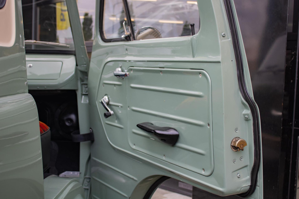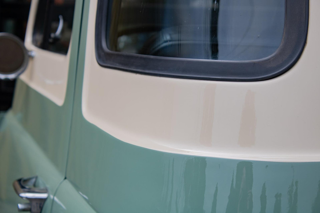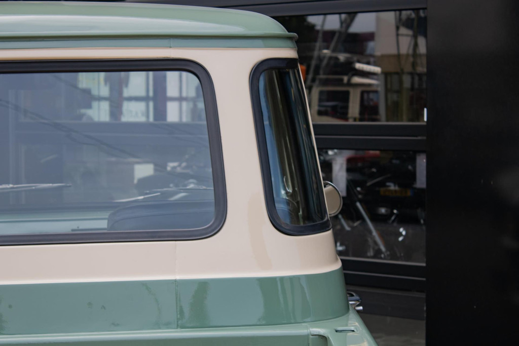 De lak is uitgevoerd in een stijlvolle lichte olijfgroene kleur, fraai gecombineerd met witte accenten die het klassieke lijnenspel benadrukken. De laadbak is volledig opnieuw opgebouwd met houtdelen en aluminium strips, wat zorgt voor een ambachtelijke en hoogwaardige uitstraling. Als finishing touch is deze pick-up voorzien van Eagle Alloys lichtmetalen velgen en verchroomde spiegels, die het retro-karakter versterken.