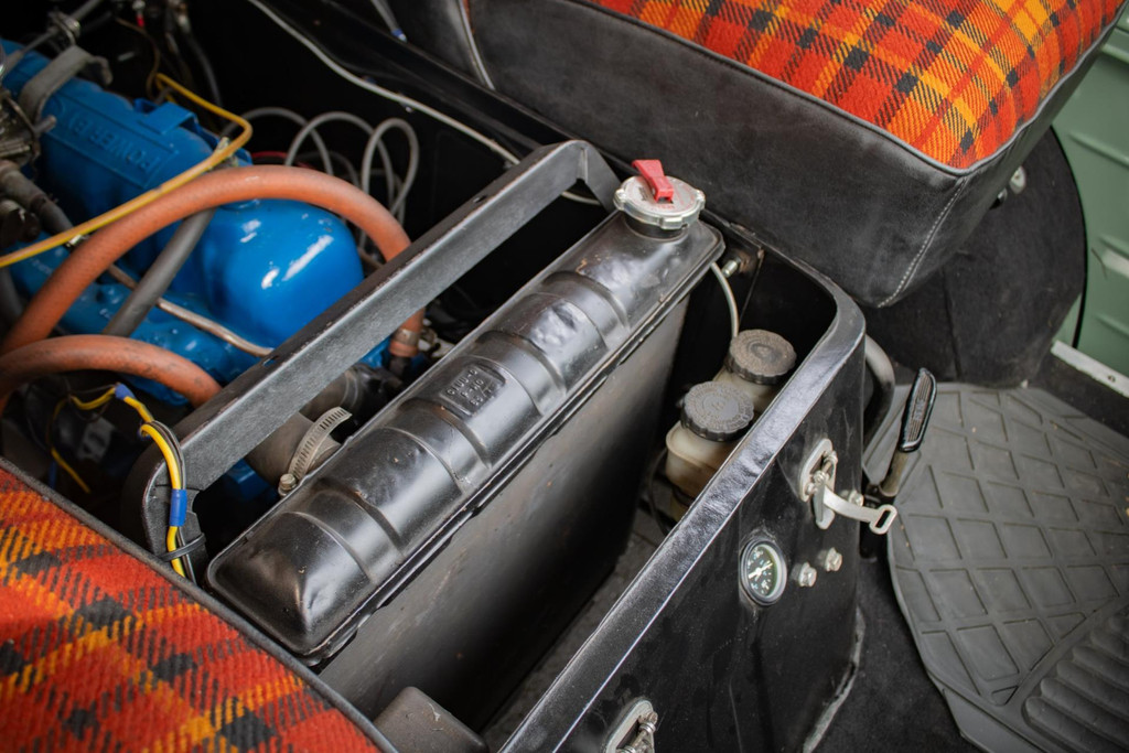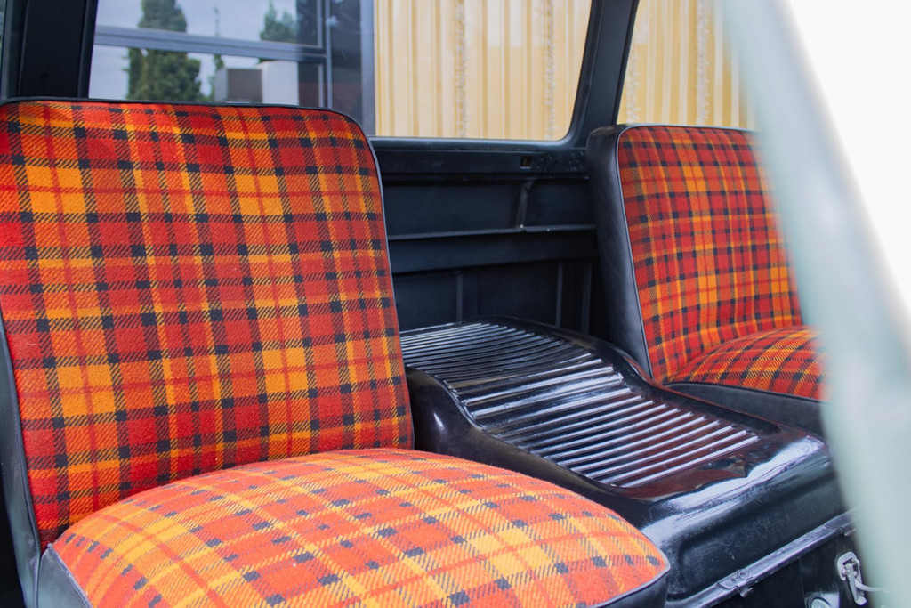 Im Innenraum finden wir eine originelle, aber einzigartige Ausstattung mit Tartan-Polstern in Orange, Rot und Schwarz - eine Anspielung auf die 1960er Jahre, aber mit einem frischen, individuellen Touch. Alles ist sehr gepflegt und funktionell.