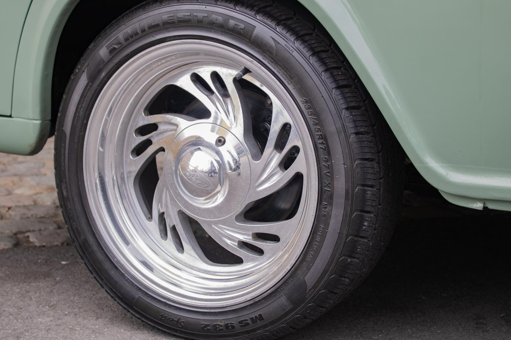 The paint is done in a stylish light olive green colour, beautifully combined with white accents that emphasise the classic lines. The cargo bay has been completely rebuilt with wood parts and aluminium strips, giving it an artisanal and high-quality look. As a finishing touch, this pick-up is fitted with Eagle Alloys alloy wheels and chrome mirrors, adding to its retro character.