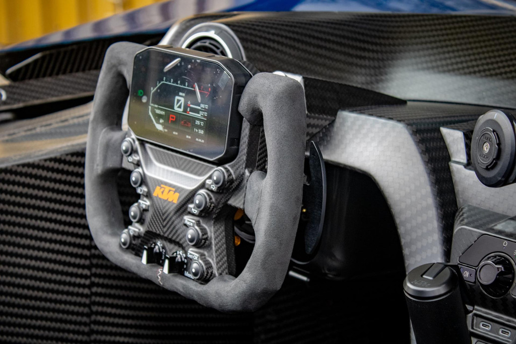 Dieses Exemplar hat nur 27 Testkilometer auf dem Kilometerzähler und ist in absolutem Neuzustand. Das Fahrzeug wurde auch im Detail mit exklusiven goldfarbenen Akzenten personalisiert: So sind die Felgen in Gold Gloss lackiert, inklusive der KTM-Logos auf den Radnabenabdeckungen. Die Bremssättel sind ebenfalls in RAL 9005 schwarz mit goldenen Logos ausgeführt. Darüber hinaus sind die Aufhängung, die Embleme (innen und außen), die Nähte der Sitze, die Abschleppöse und die Plakette „100 Limited Edition“ in Gold ausgeführt. Der GT-XR fährt auf Pirelli P ZERO TROFEORACE Semi-Slicks, die auf 19-Zoll-Reifen vorne und 20-Zoll-Reifen hinten montiert sind.