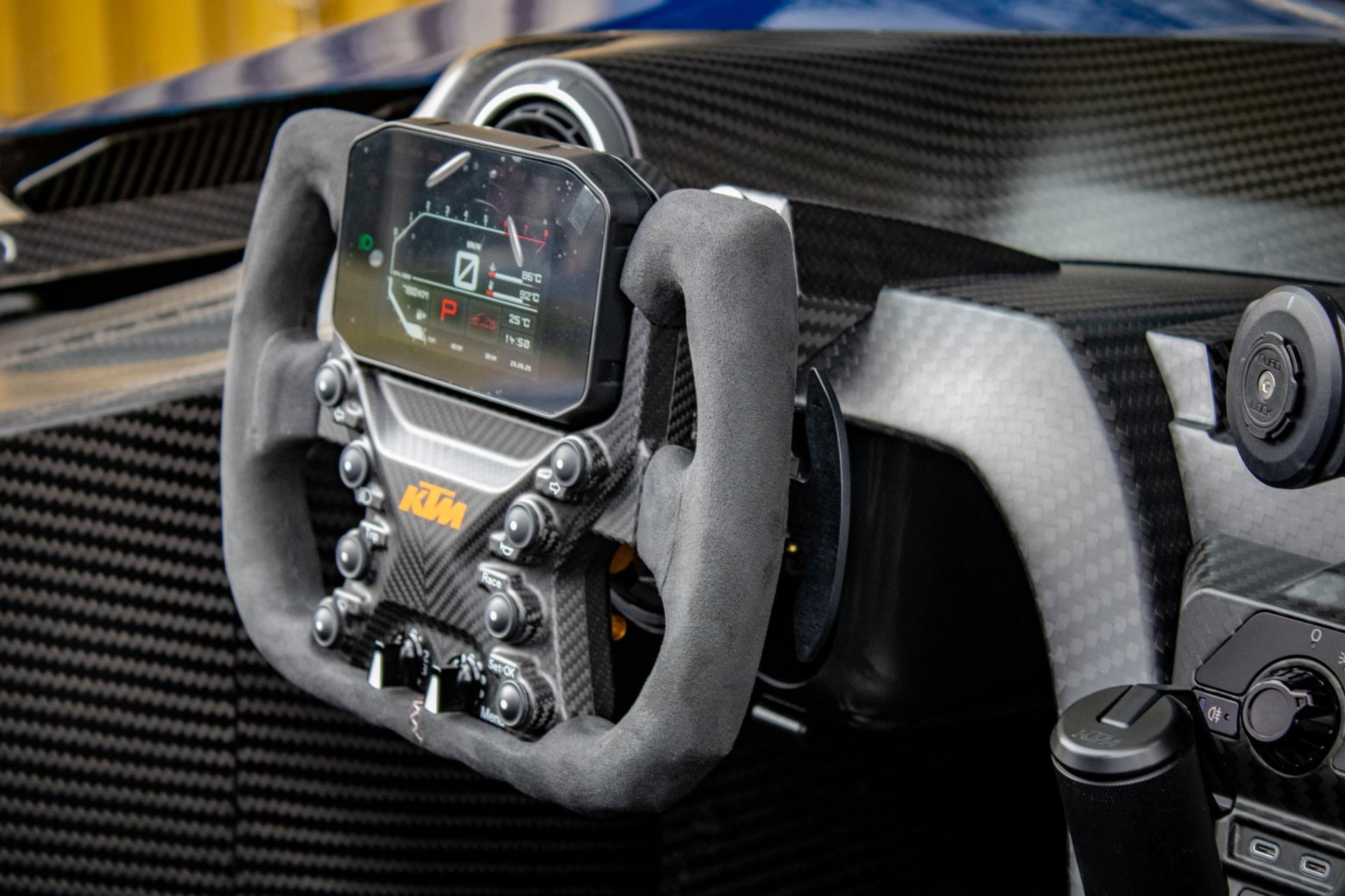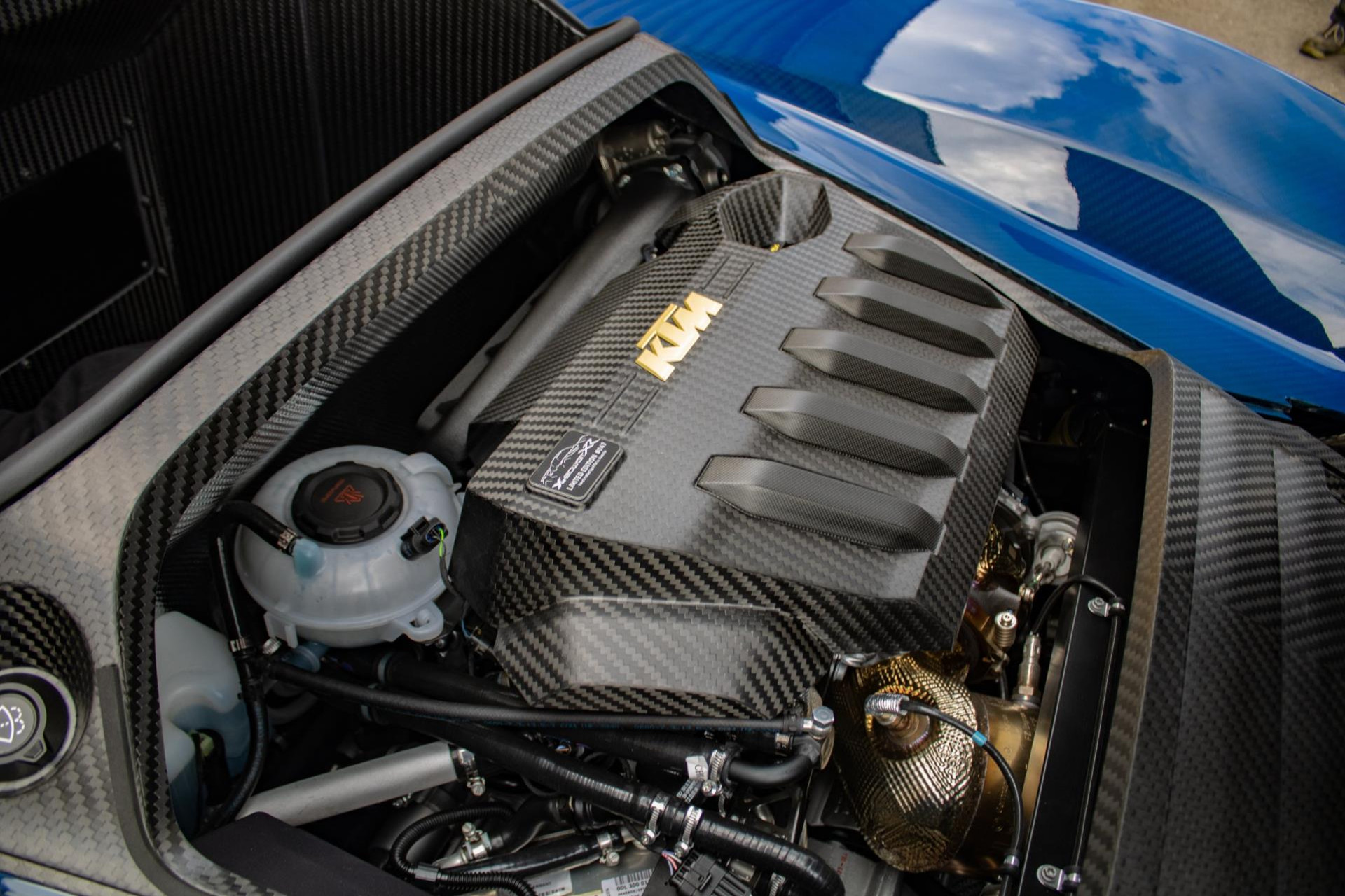 Dit exemplaar heeft slechts 27 testkilometers op de teller en verkeert in absolute nieuwstaat. De auto is bovendien tot in de details gepersonaliseerd met exclusieve goudkleurige accenten: zo zijn de velgen uitgevoerd in Gold Gloss, inclusief de KTM-logo’s op de wheelhub covers. Ook de remklauwen zijn uitgevoerd in RAL 9005 zwart met gouden logo’s. Verder zijn de vering, emblemen (binnen en buiten), stoelstiksels, sleepoog en de ‘100 Limited Edition’ badge allemaal afgewerkt in goud. De GT-XR staat op Pirelli P ZERO TROFEORACE semi-slicks, gemonteerd op 19 inch voor en 20 inch achter.