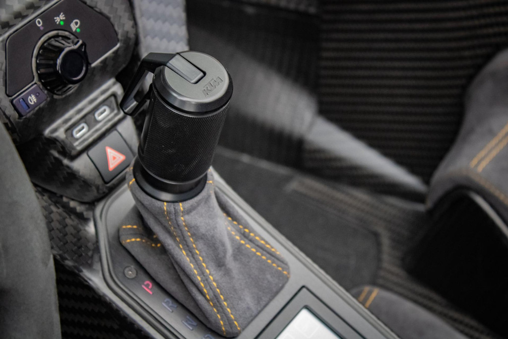 This example has only 27 test kilometres on the odometer and is in absolute new condition. The car has also been personalised in detail with exclusive gold-coloured accents: the rims, for instance, are finished in Gold Gloss, including the KTM logos on the wheelhub covers. The brake calipers are also finished in RAL 9005 black with gold logos. Furthermore, the suspension, emblems (inside and outside), seat stitching, towing eye and the “100 Limited Edition” badge are all finished in gold. The GT-XR is on Pirelli P ZERO TROFEORACE semi-slicks, mounted on 19-inch front and 20-inch rear.