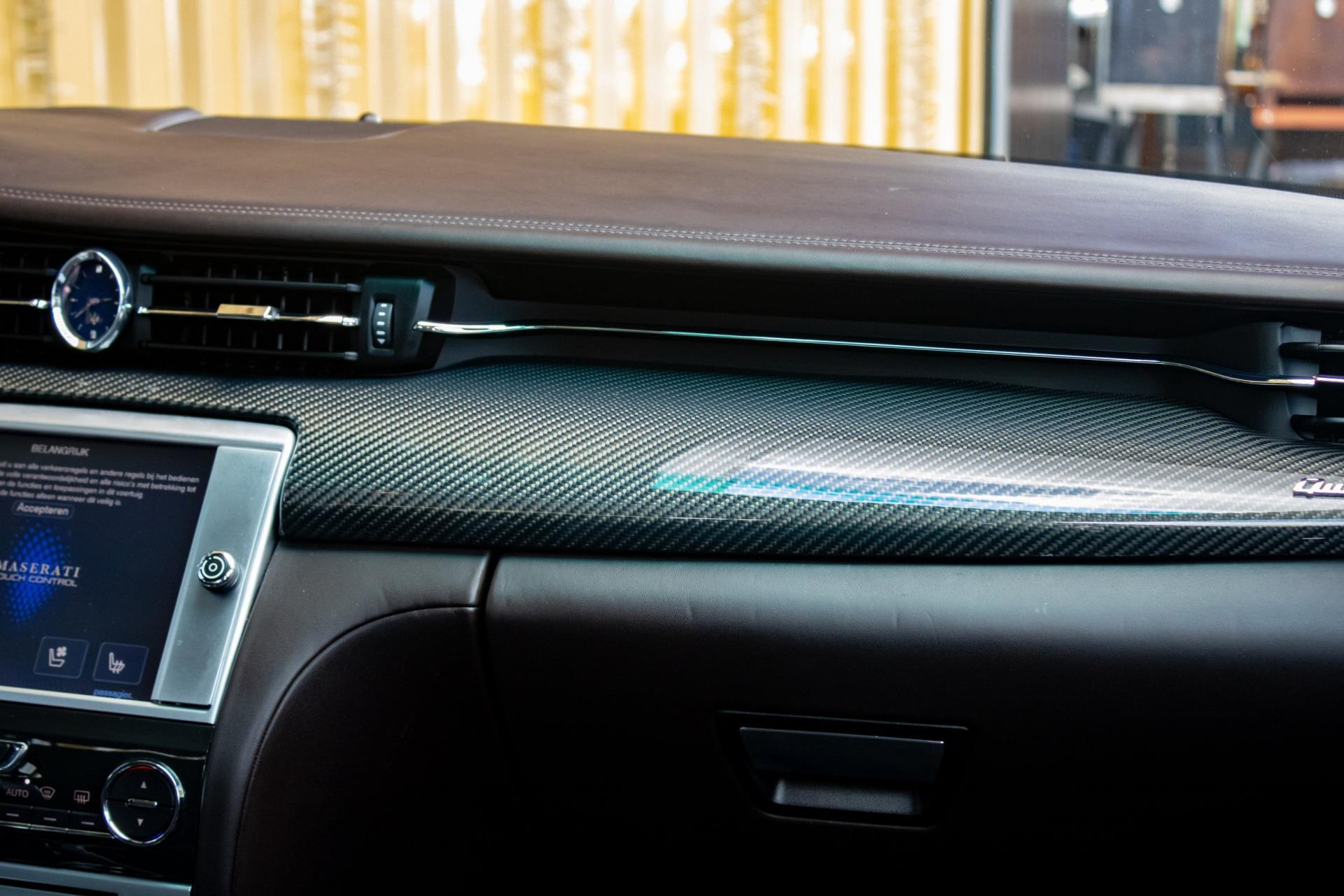 Het interieur biedt luxe en comfort met elektrisch verstelbare stoelen die zowel verwarmd als gekoeld kunnen worden, een vierzone automatische klimaatregeling, een premium audiosysteem, navigatie en diverse moderne comfortvoorzieningen zoals sleutelvrije toegang. Wat deze Quattroporte echt uniek maakt, is de sportstand waarin de kleppen van de originele uitlaat open gaan, waardoor een ongekend krachtig en diep motorgeluid vrijkomt dat de ervaring van rijden in deze Italiaanse sportlimousine onvergetelijk maakt.