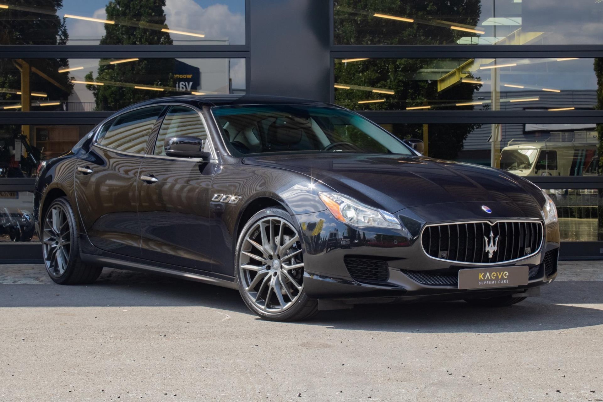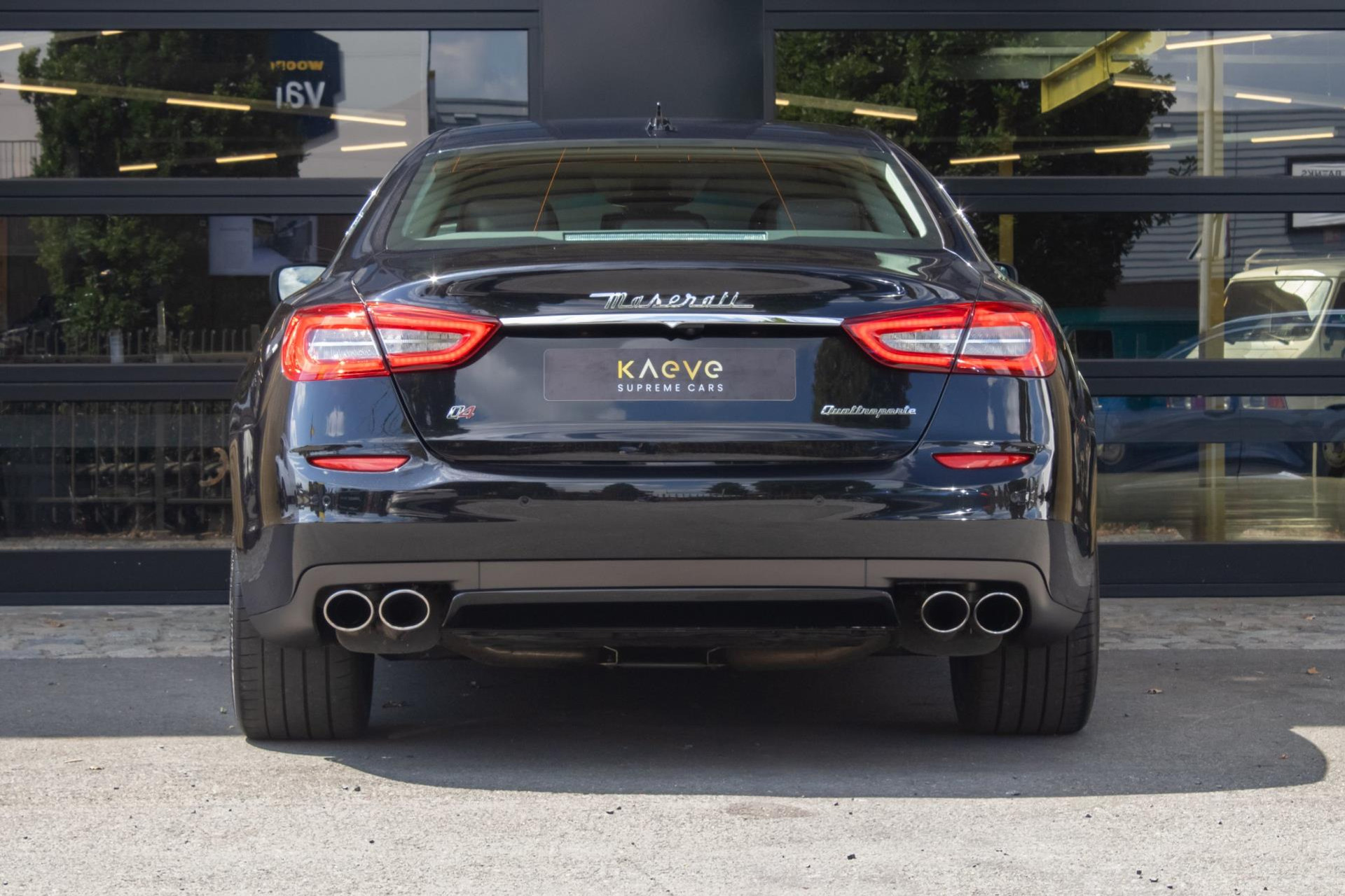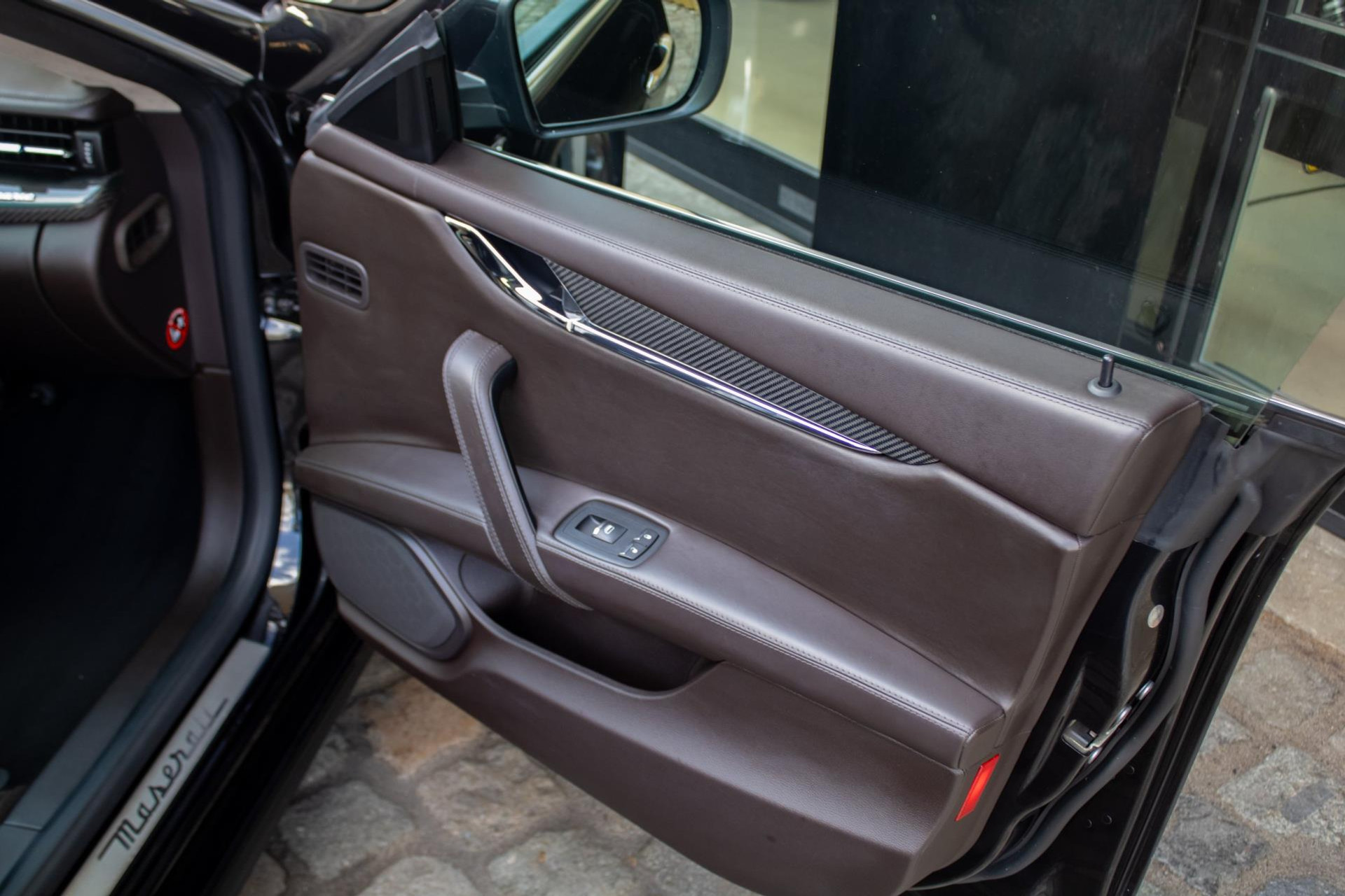 A stunning 2014 Maserati Quattroporte S Q4 with a mileage of 103,000 km. This luxury sports limousine is finished in the deep black metallic colour Nero Ribelle (Q815) and features a particularly beautiful interior with dark brown perforated leather, a beige/grey alcantara roof lining and full carbon trim in the interior. The car is equipped with a powerful 410 hp 3.0-litre V6 Bi-Turbo engine, an 8-speed automatic transmission and the Q4 all-wheel drive system, which ensures v