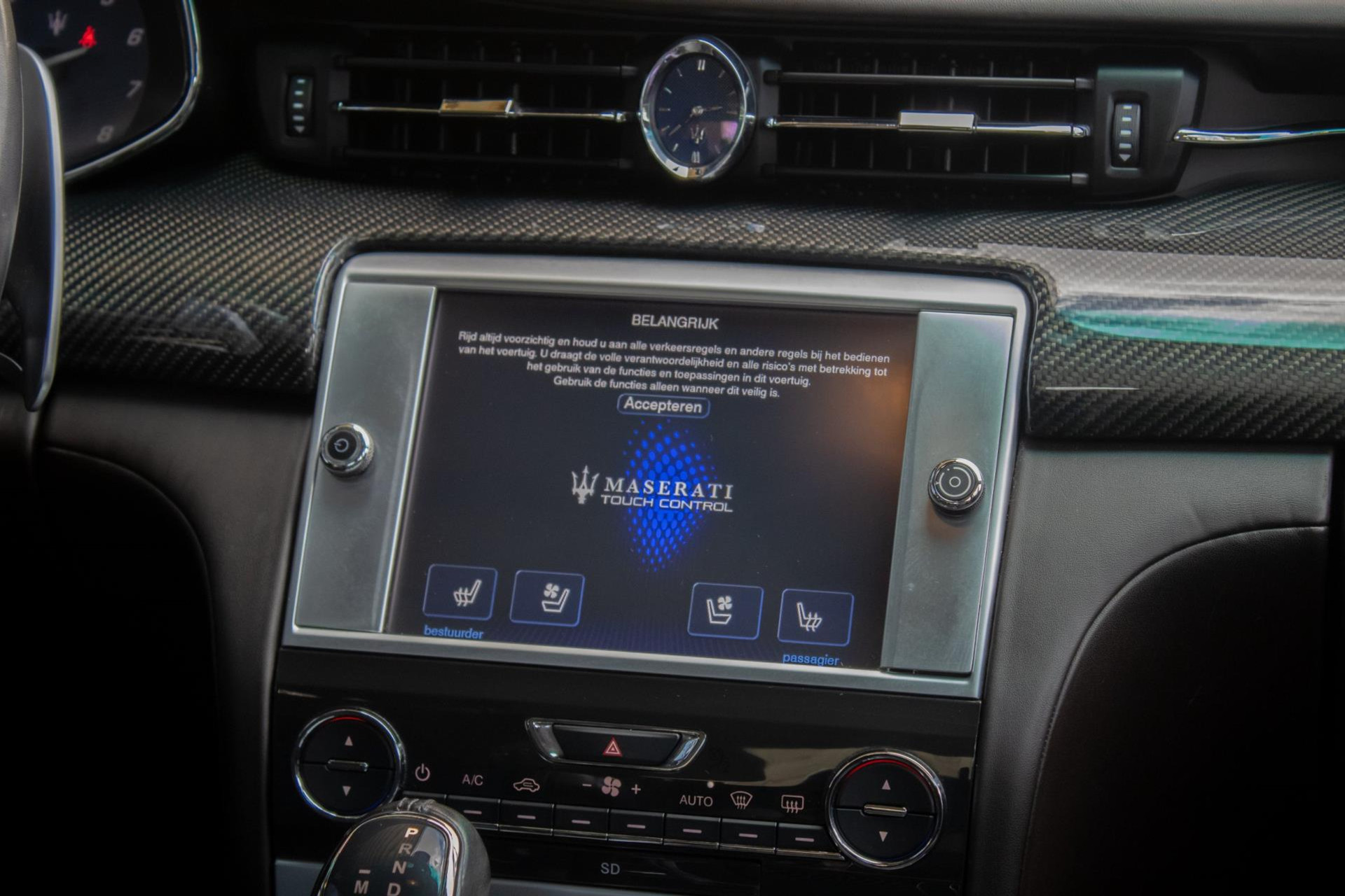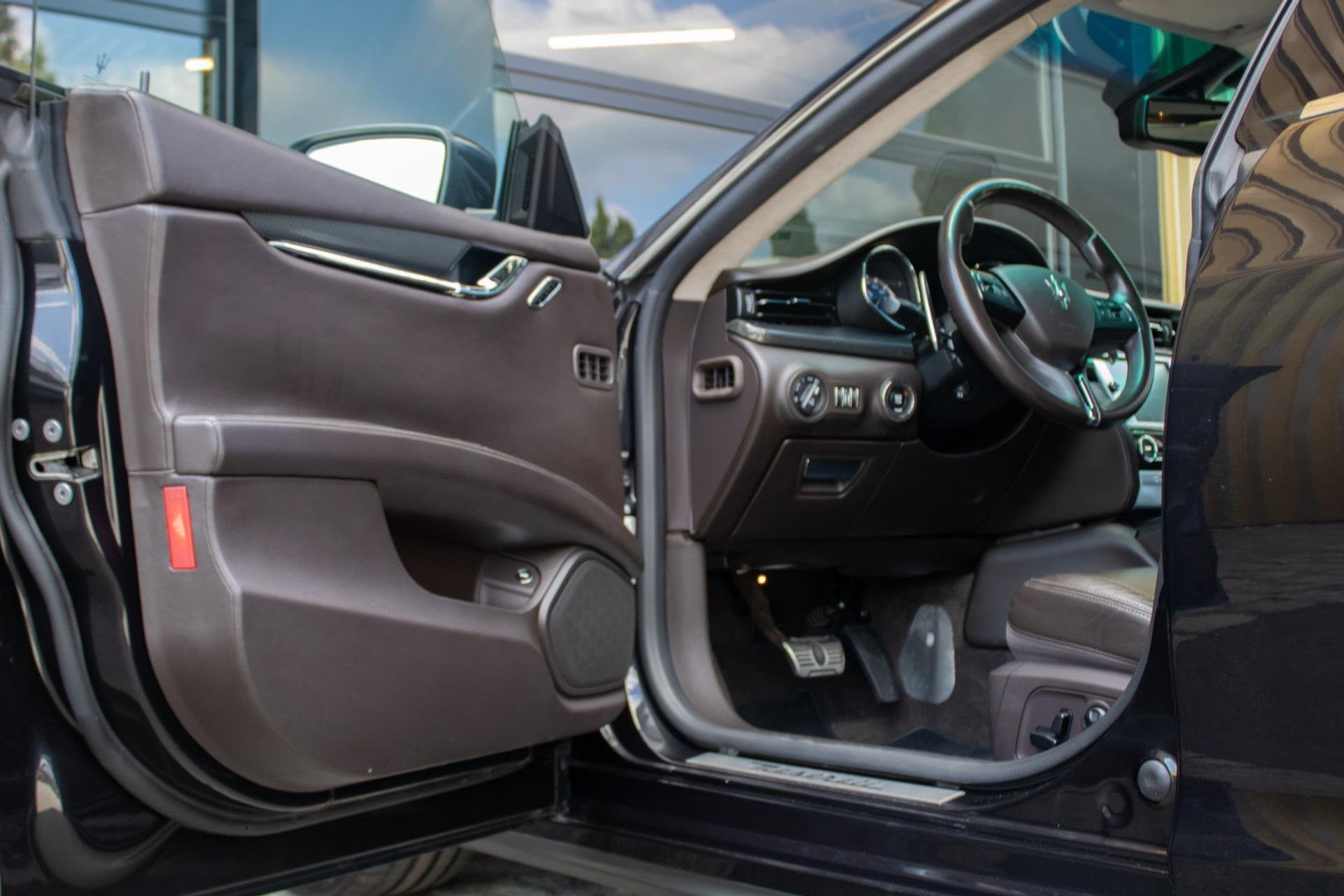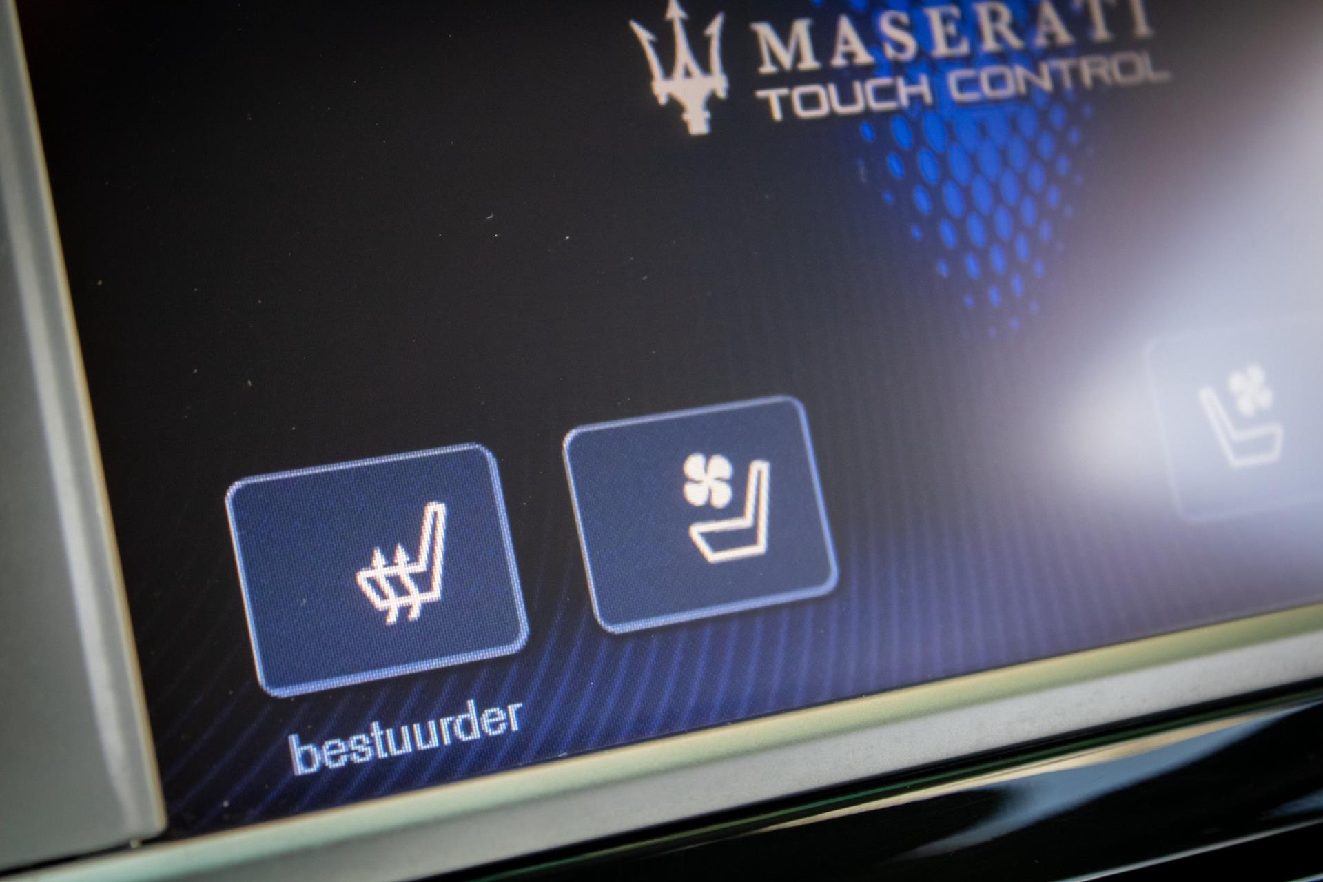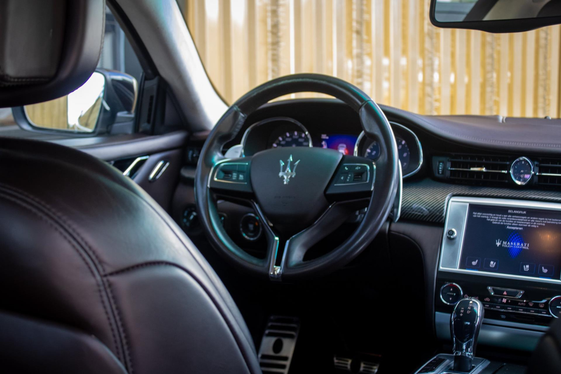 Het interieur biedt luxe en comfort met elektrisch verstelbare stoelen die zowel verwarmd als gekoeld kunnen worden, een vierzone automatische klimaatregeling, een premium audiosysteem, navigatie en diverse moderne comfortvoorzieningen zoals sleutelvrije toegang. Wat deze Quattroporte echt uniek maakt, is de sportstand waarin de kleppen van de originele uitlaat open gaan, waardoor een ongekend krachtig en diep motorgeluid vrijkomt dat de ervaring van rijden in deze Italiaanse sportlimousine onvergetelijk maakt.