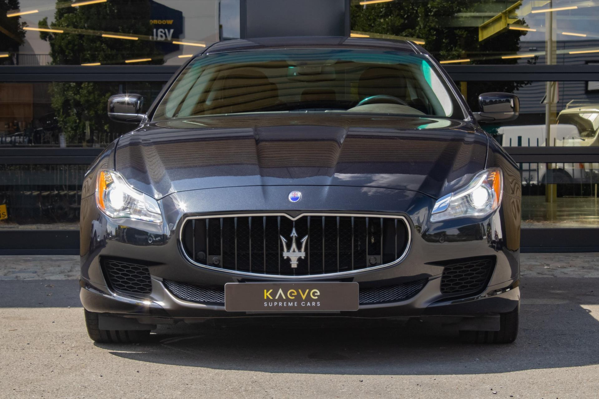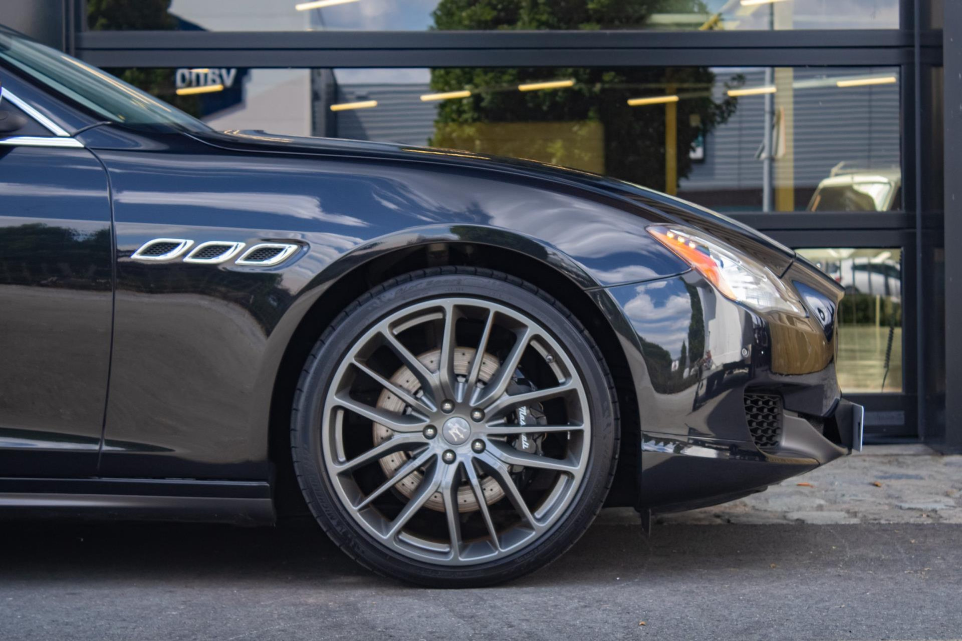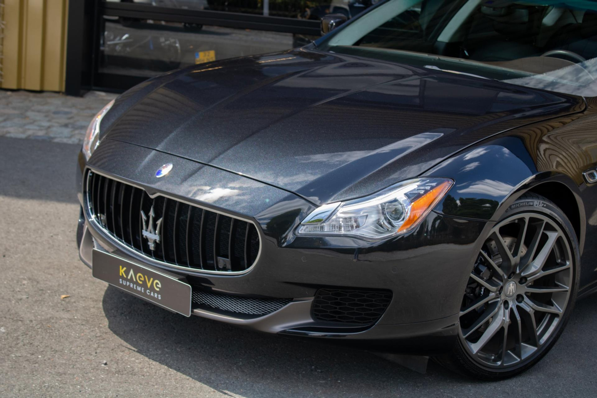 einen atemberaubenden 2014 Maserati Quattroporte S Q4 mit einem Kilometerstand von 103.000 km angeboten. Diese luxuriöse Sportlimousine ist in der tiefschwarzen Metallicfarbe Nero Ribelle (Q815) lackiert und verfügt über eine besonders schöne Innenausstattung mit dunkelbraunem perforiertem Leder, einem beige/grauen Alcantara-Dachhimmel und Vollcarbonverkleidung im Innenraum. Der Wagen ist mit einem leistungsstarken 3,0-Liter-V6-Bi-Turbo-Motor mit 410 PS, einem 8-Gang-Automatikgetriebe und dem Q4-Allradantriebssystem ausgestattet, das unter allen Bedingungen für exzellente Leistung und Haftung sorgt.
