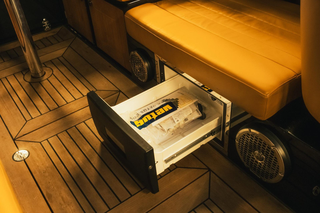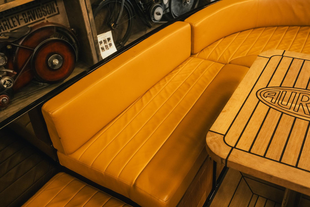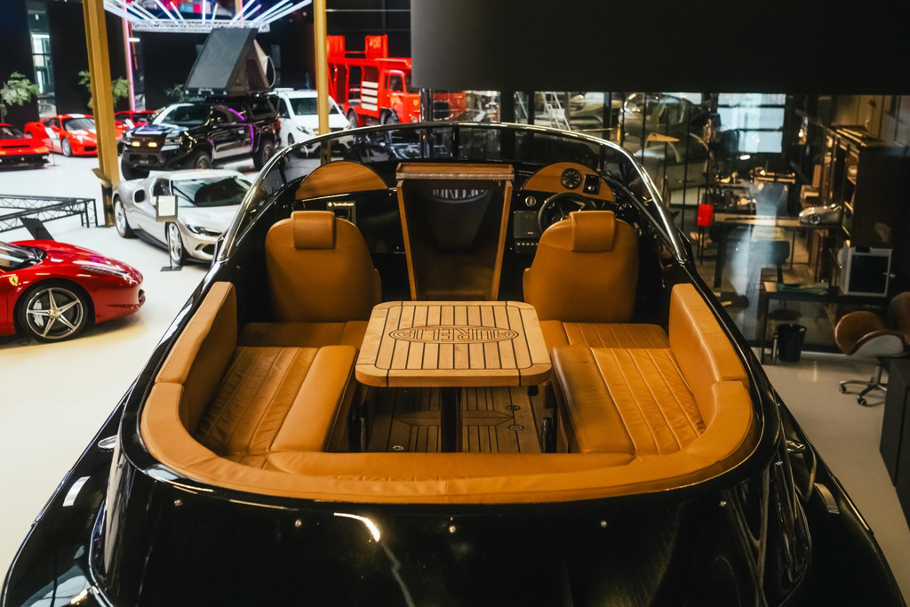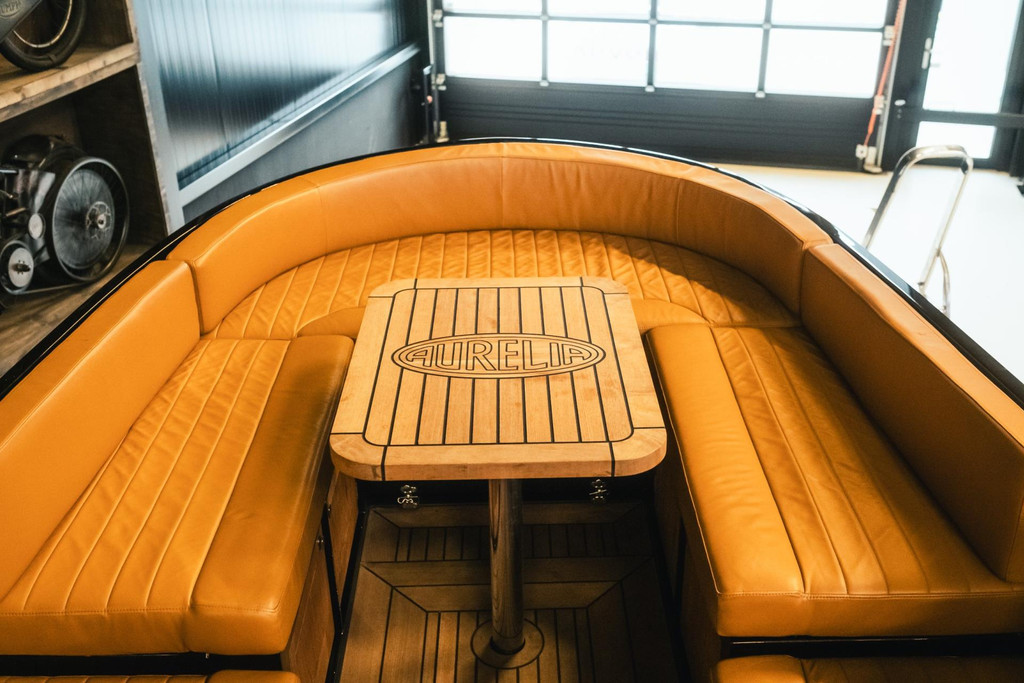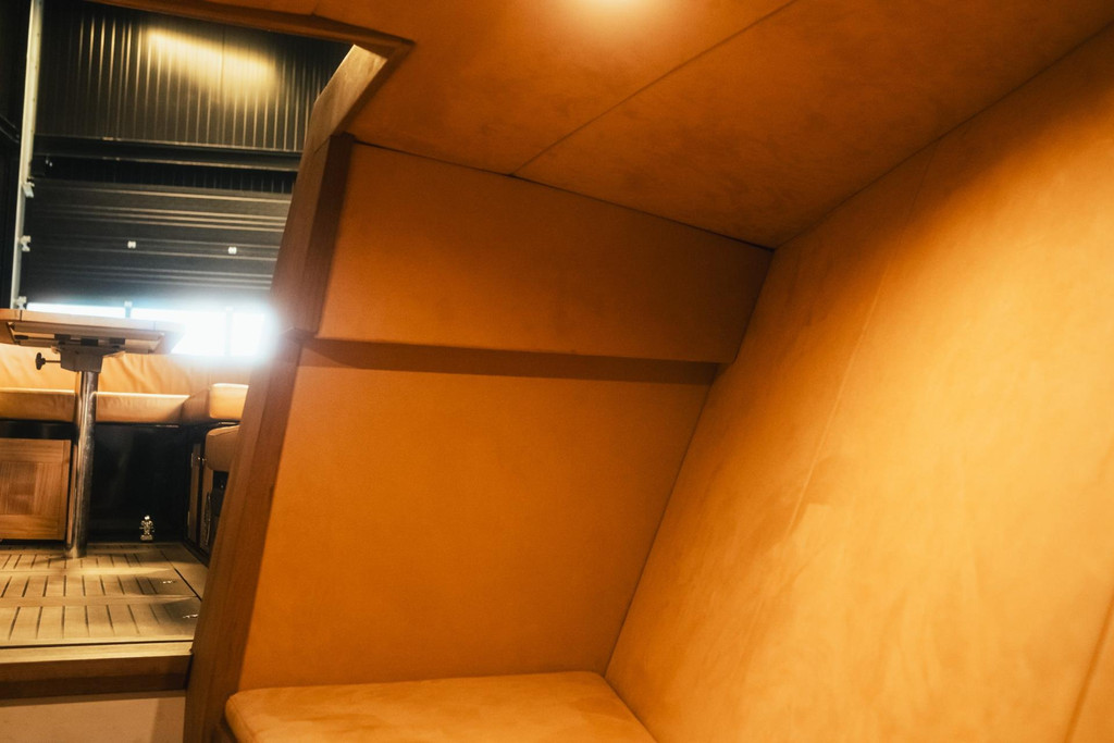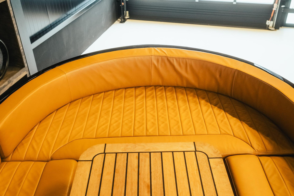Das Interieur ist ebenso beeindruckend wie das Exterieur. Hellbraune Cognac-Lederpolster, stimmungsvolle Beleuchtung und moderne Teak-Holz-Akzente schaffen eine luxuriöse, warme Atmosphäre. Die Yacht verfügt über eine Kabine, zwei bequeme Innenbänke, einen runden Sitzbereich mit Tisch am Achterdeck, einen integrierten Kühlschrank und Polster für maximalen Komfort.