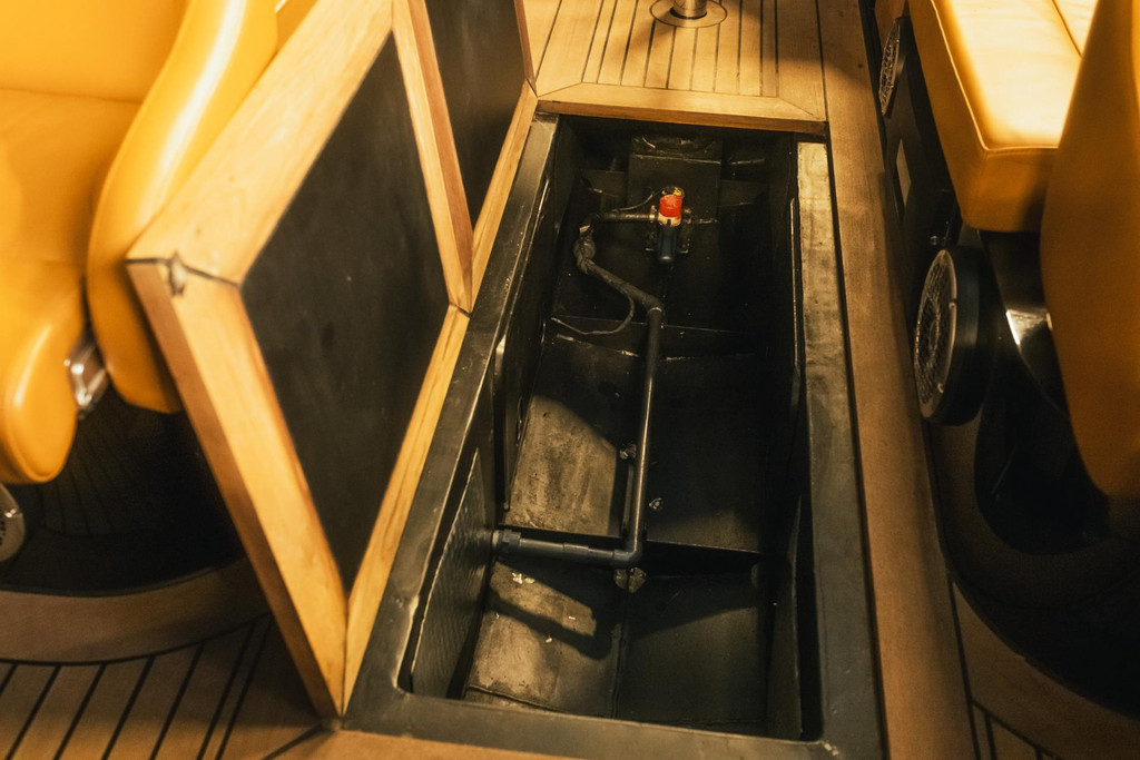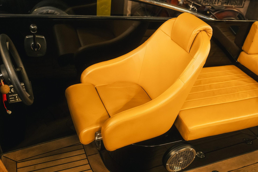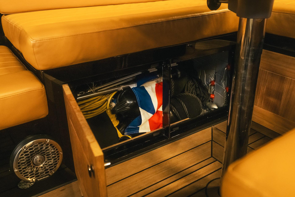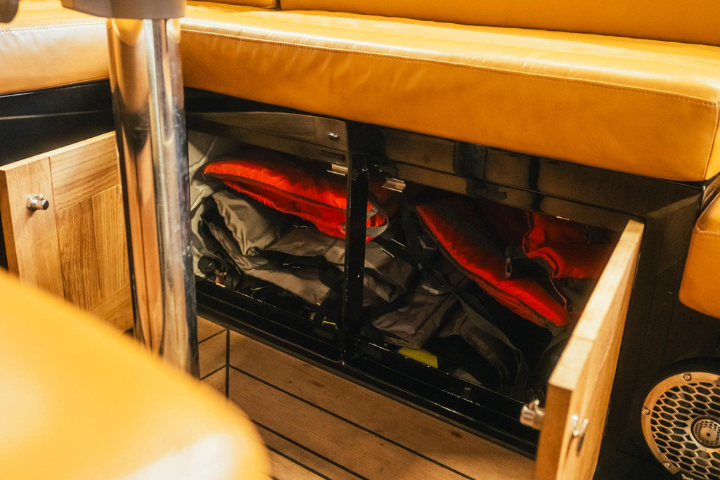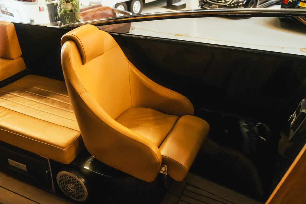 Het interieur is even indrukwekkend als het exterieur. Lichtbruine cognac-lederen bekleding, sfeerverlichting en een moderne houten afwerking creëren een warme en luxueuze sfeer. De boot beschikt over één hut, twee comfortabele banken binnen, een gezellige ronde zitgroep met tafel op het achterdek, een geïntegreerde koelkast en kussens voor ultiem comfort.