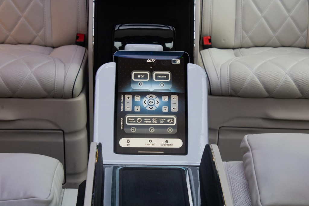 The cabin is equipped with a TV and Apple TV, both integrated into an electrically extendable partition separating the driver from the passengers. A dedicated climate system keeps the passenger area perfectly conditioned, while Starlink WiFi ensures you’re always connected.