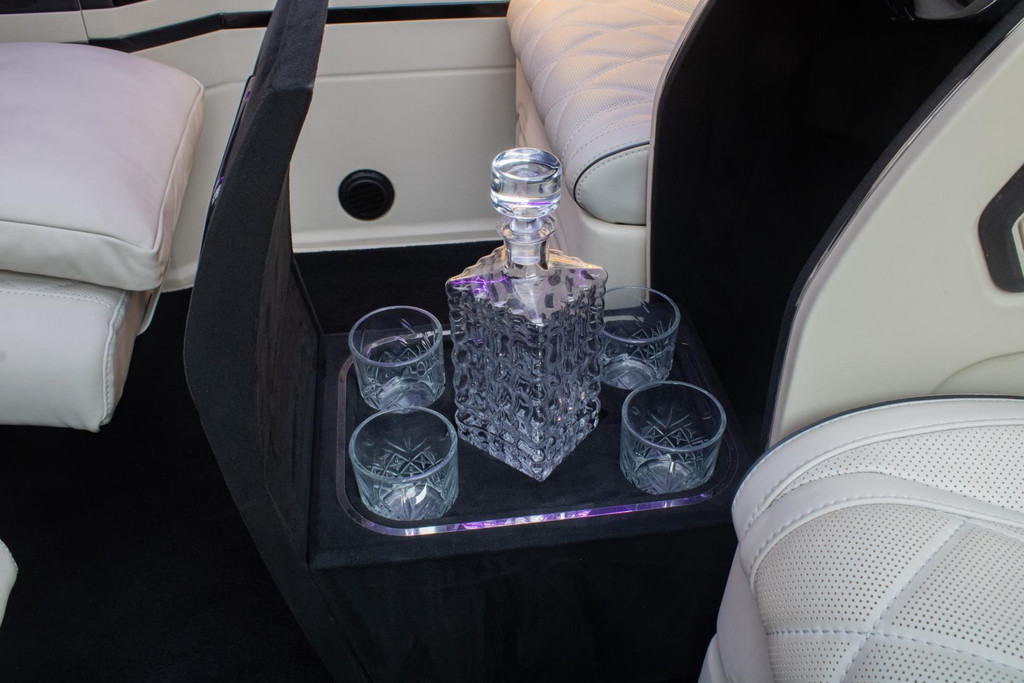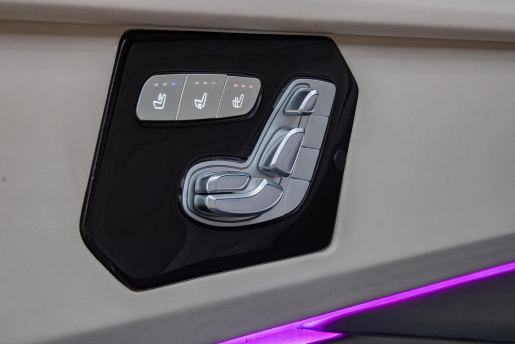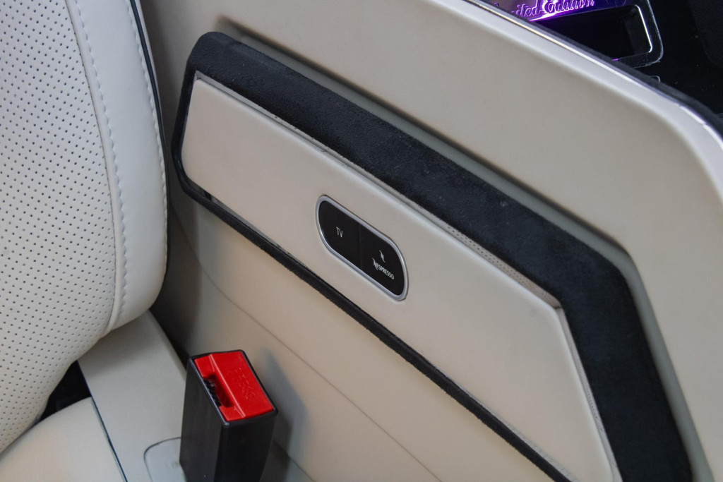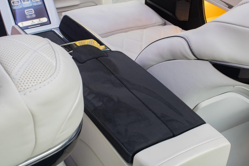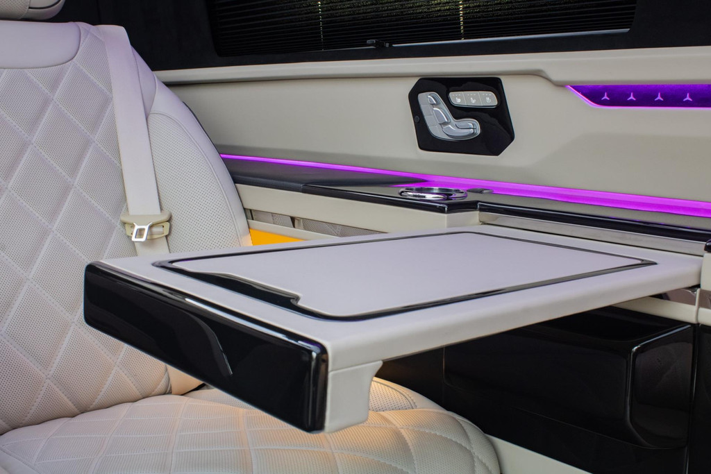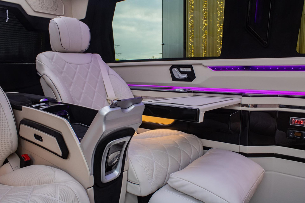 Vier Mercedes-Captain-Chairs, davon zwei mit Beinauflage, laden zum ultimativen Komfort ein. Sitzheizung, Belüftung und drei Massageprogramme sorgen dafür, dass jede Fahrt entspannend wird. Elektrisch ausfahrbare Tische, eine Nespresso-Bar und eine Whiskybar machen den Innenraum modular und funktional – alles vom Sitz oder per iPad steuerbar.