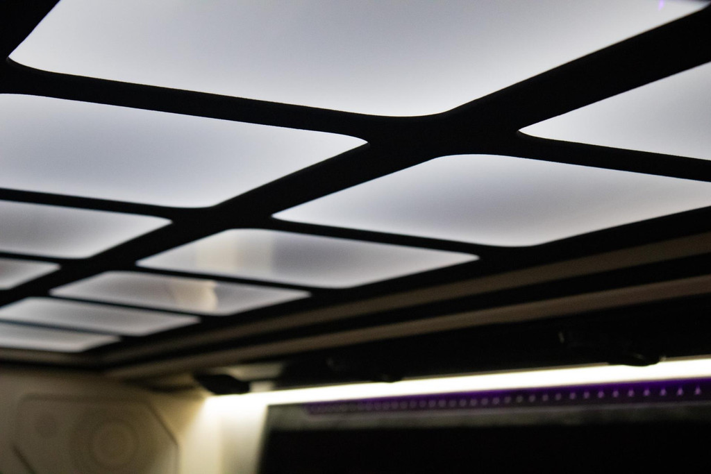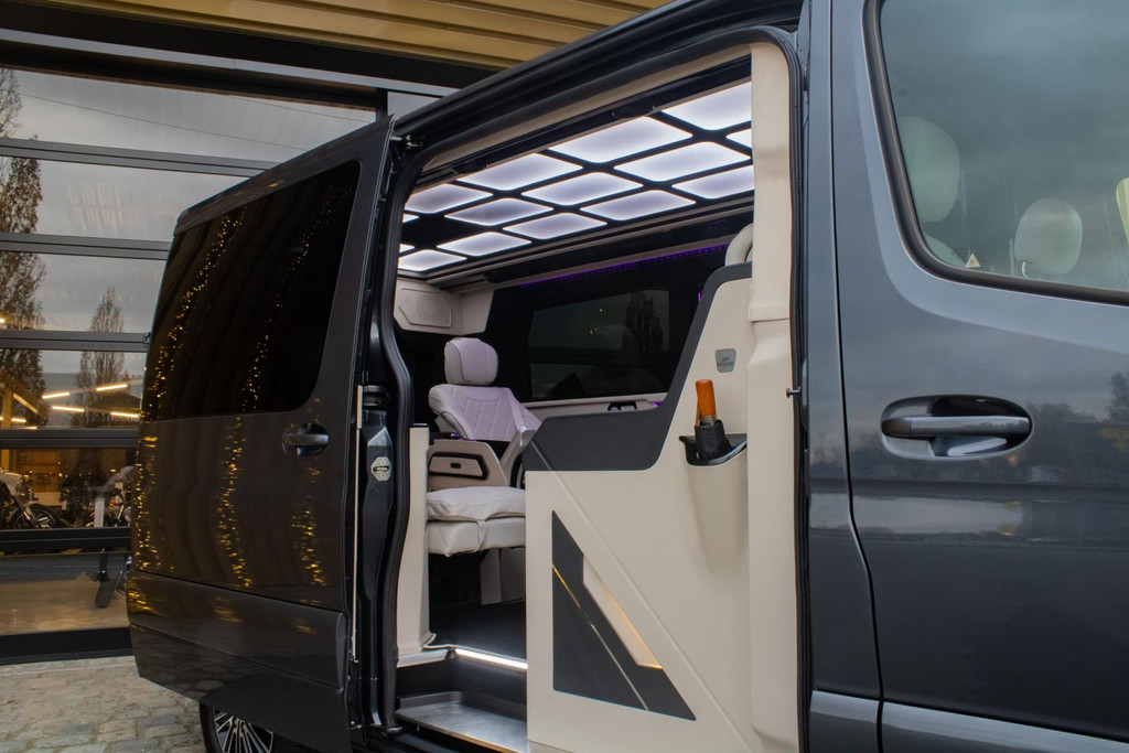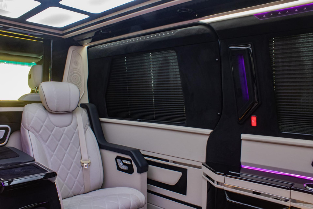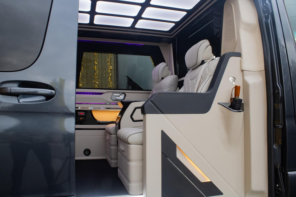 Man muss es selbst erleben. Sobald die Tür schließt, umgibt einen eine Welt aus Luxus. Die dimmbare Glasoptik-Decke und die Ambientebeleuchtung setzen den Ton, während die hochwertigen beige Leder-/Alcantara-Polster und hochglänzenden Paneele das exklusive Ambiente perfekt abrunden. Hier sitzt man nicht in einem Transporter – man befindet sich in einer Executive-Lounge auf Rädern, geräumiger und luxuriöser als viele S-Klasse-Toplimousinen.