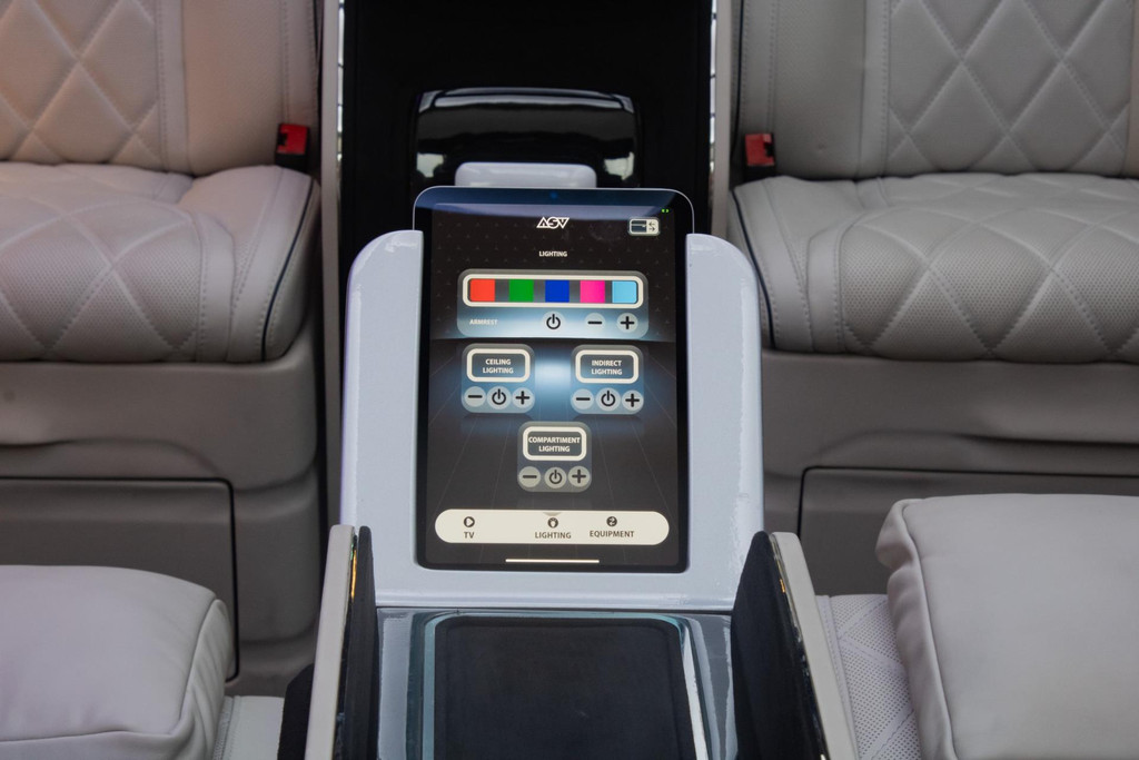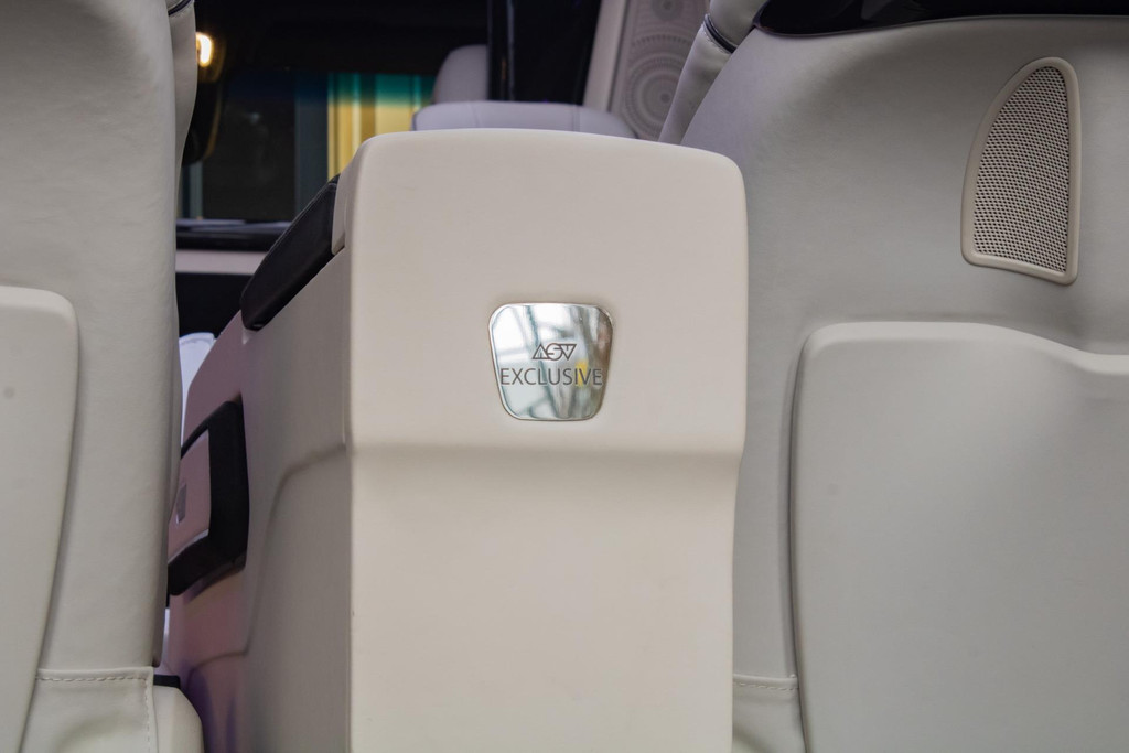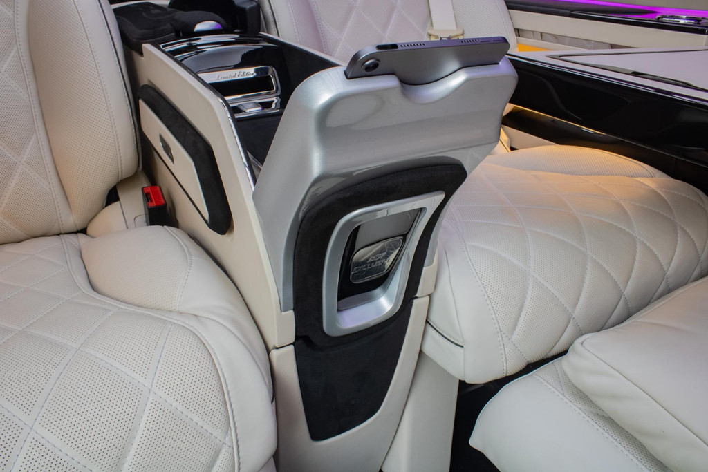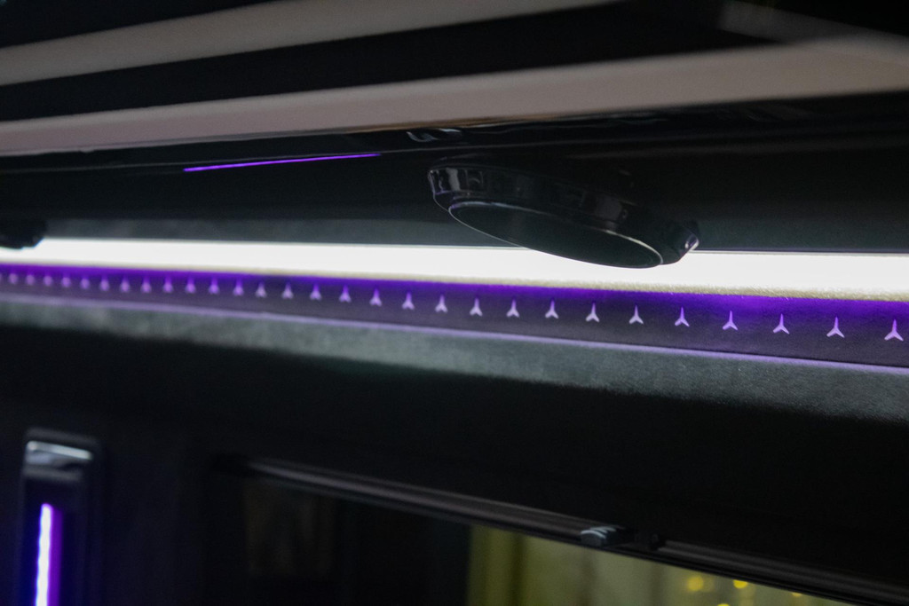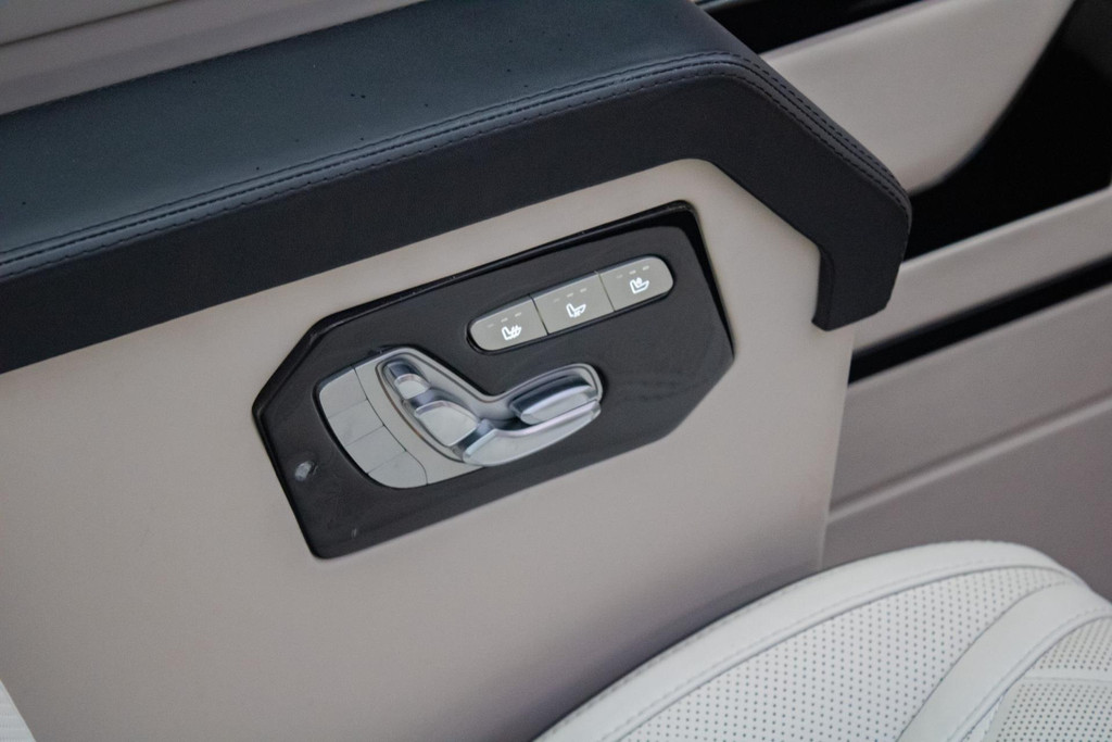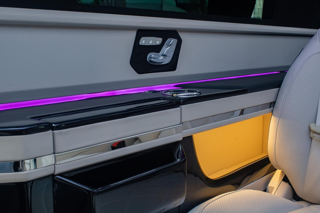 You have to experience it yourself. When the door closes, a world of luxury surrounds you. The dimmable glass-look ceiling and ambient lighting set the tone, while the premium beige leather/alcantara upholstery and high-gloss panels complete the sense of exclusivity. You are not sitting in a van — you’re in an executive lounge on wheels, more spacious and more luxurious than many top-tier S-Class limousines.