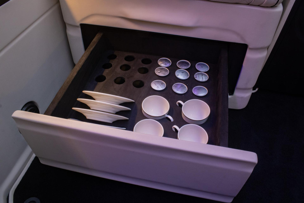 Four Mercedes captain’s chairs, two of them with leg-support extensions, invite you to experience ultimate comfort. Heating, cooling and three massage programs allow you to relax as you travel. Electrically extending tables, a Nespresso bar and a whisky bar make the interior modular and functional — all operated from your seat or via iPad.