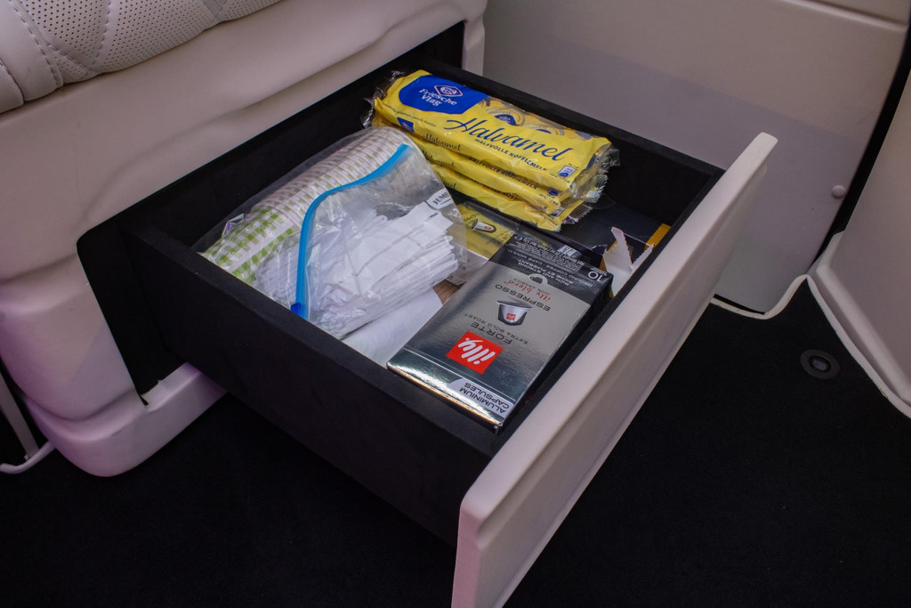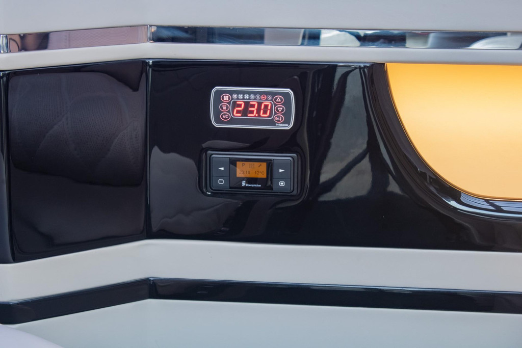 Vier ergonomische Mercedes captain seats — waarvan twee met beenondersteuning — bieden eersteklas comfort. Verwarming, koeling en drie massageprogramma’s zorgen dat elke rit ontspannend is. Elektrisch uitschuifbare tafels, een geïntegreerde Nespresso-bar en een whiskybar maken het interieur compleet functioneel en volledig modulair. Alles is te bedienen via de persoonlijke bedieningselementen of via iPad.