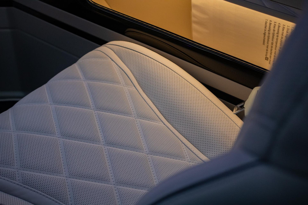 Het dimbare glasslook-plafond en de subtiele sfeerverlichting creëren direct de juiste ambiance. Beige leder met alcantara-accenten, hoogglans interieurdelen en perfect afgewerkte details tillen het geheel naar het niveau van een topklasse limousine. Hier reis je niet; hier verblijf je.