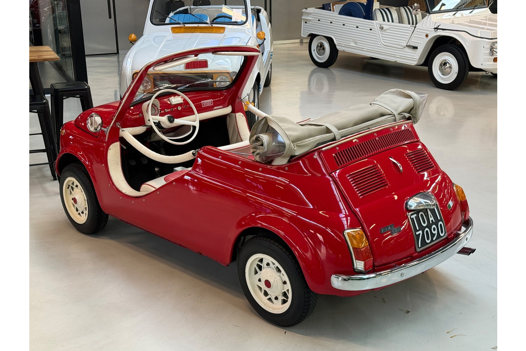Uitgevoerd in een krachtige rode lak, gecombineerd met een rood-wit lederen interieur, ademt deze Jolly pure jaren ’60 charme. De crèmekleurige velgen zorgen voor een verfijnd contrast en versterken het klassieke silhouet. Het open karakter geeft de auto zijn onweerstaanbare uitstraling — luchtig, ontspannen en uitgesproken stijlvol.