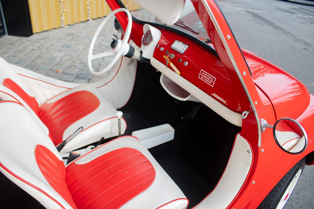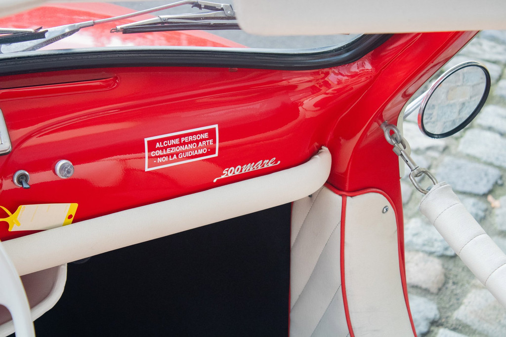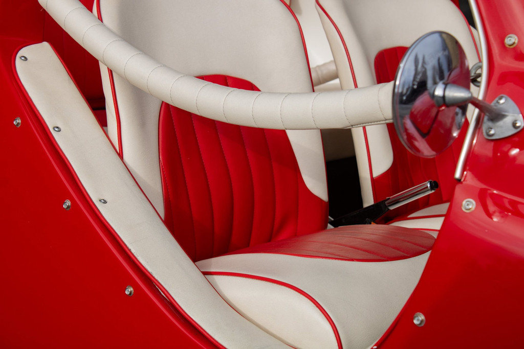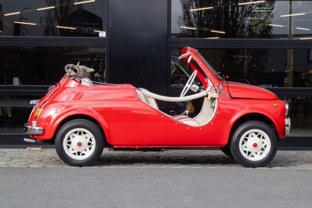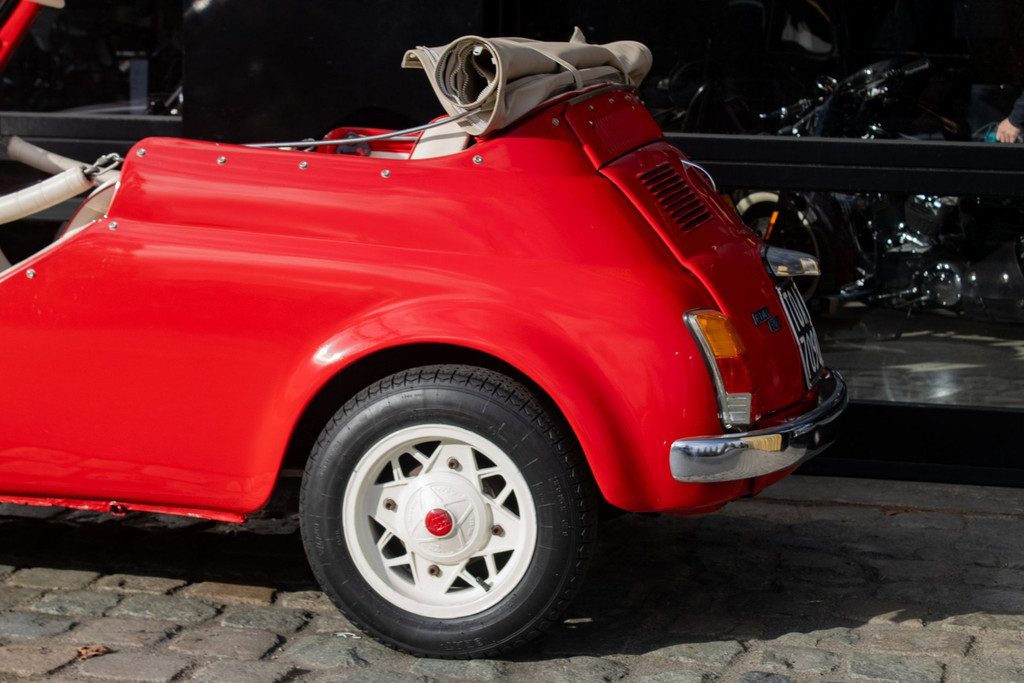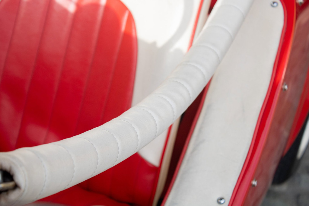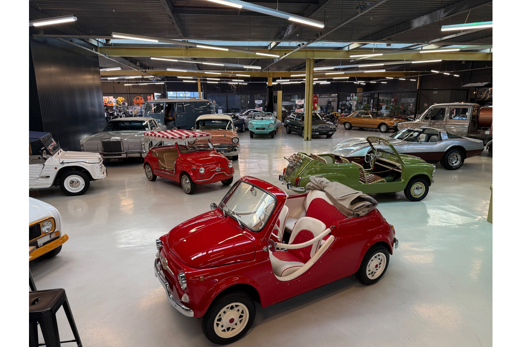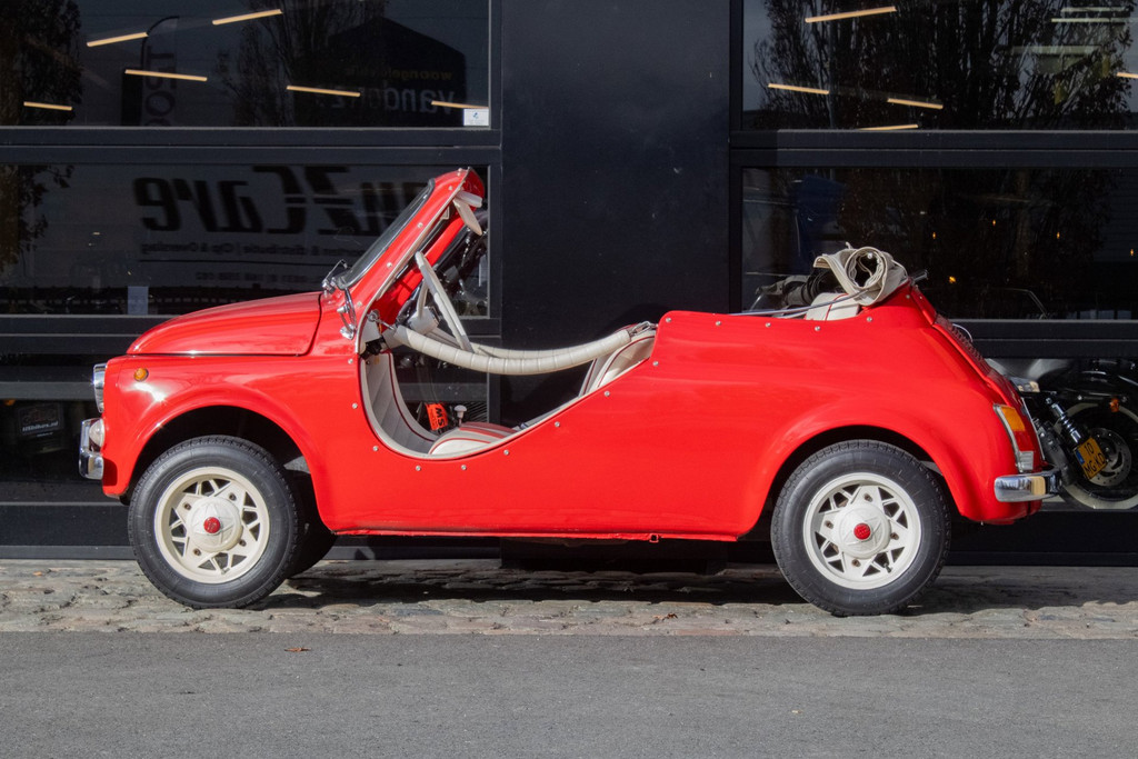Uitgevoerd in een krachtige rode lak, gecombineerd met een rood-wit lederen interieur, ademt deze Jolly pure jaren ’60 charme. De crèmekleurige velgen zorgen voor een verfijnd contrast en versterken het klassieke silhouet. Het open karakter geeft de auto zijn onweerstaanbare uitstraling — luchtig, ontspannen en uitgesproken stijlvol.